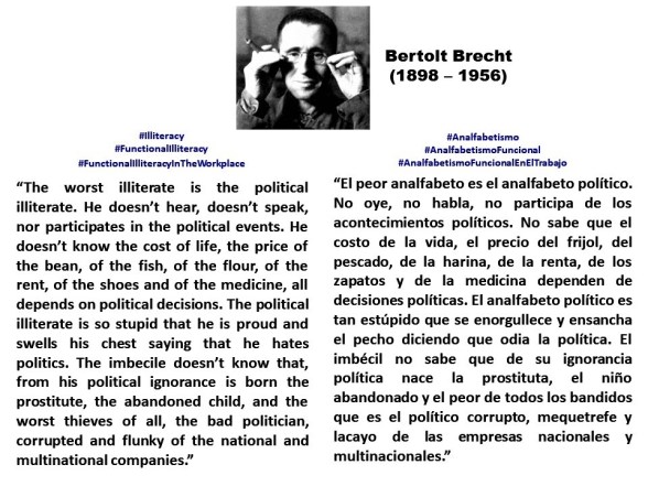 “El peor analfabeto es el analfabeto político. No oye, no habla, no participa de los acontecimientos políticos. No sabe que el costo de la vida, el precio del frijol, del pescado, de la harina, de la renta, de los zapatos y de la medicina dependen de decisiones políticas. El analfabeto político es tan estúpido que se enorgullece y ensancha el pecho diciendo que odia la política. El imbécil no sabe que de su ignorancia política nace la prostituta, el niño abandonado y el peor de todos los bandidos que es el político corrupto, mequetrefe y lacayo de las empresas nacionales y multinacionales.”