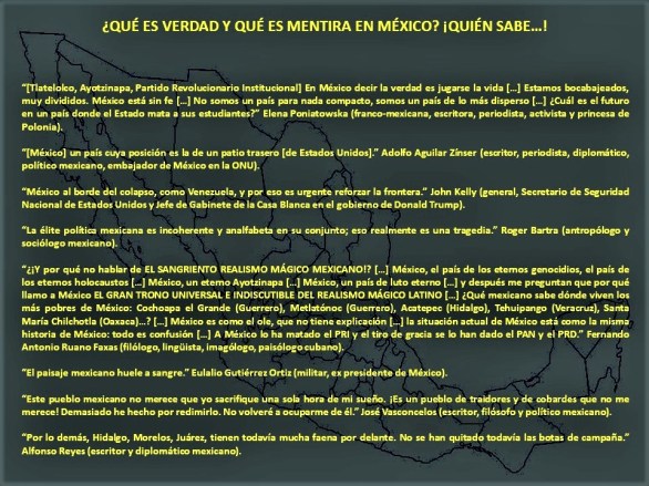[…] ¿De cuál independencia de México hablas? En primera, México es el país de los eternos genocidios, de los eternos holocaustos. México es el país de los eternos Tlatlaya, de los eternos Ayotzinapa. En México la gente ya perdió la cifra de los asesinados y de los desaparecidos: ¡son tantos! Como decía el presidente mexicano Eulalio Gutiérrez Ortiz: “El paisaje mexicano huele a sangre”. Y los mexicanos sobreviven gracias a las remesas de dólares que mandan esos migrantes que México ha expulsado hacia Estados Unidos. Si se dejara de enviar esas remesas, en un mes México colapsa […] Y en cuanto a pobreza y la cantidad de dinero que consideran los países realmente civilizados para que una familia pueda vivir decentemente, viendo estas cifras, ya es mejor preguntar quién no es pobre en México […]