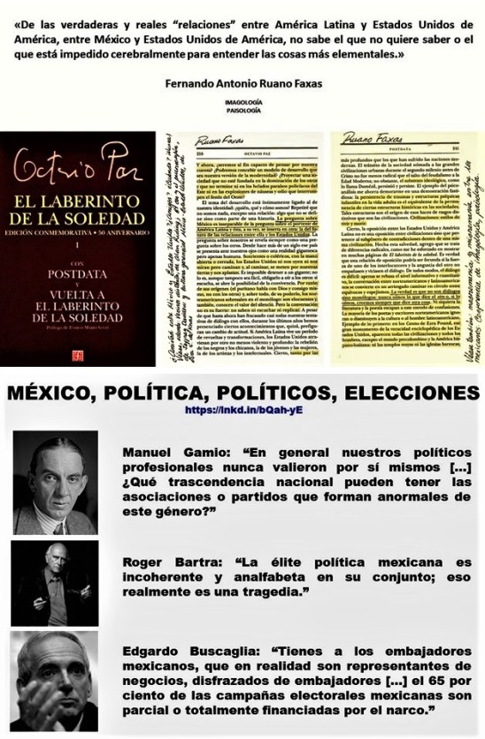 […] «La historia, el pasado, y el presente, y así como vamos también el futuro, de América Latina, y sobre todo de “estos pueblos que siempre se destacan”, es como si fuera una pesadilla, una terrible pesadilla en la que sueñas que estás metido en un oscuro y hediondo teatro de burlesque en donde los que actúan son monstruosos enanos deformes y ensangrentados con máscaras de hiena y corazón de cerdo […] ¡Qué asco, Dios mío!» […] Como dice Octavio Paz: «Muchos pueblos gozan de libertad de expresión, pocos la utilizan para algo que no sea mentirse entre ellos, calumniarse y engañarse […] nuestra historia es un tejido de mentiras […] ¡nuestra vida diaria sería inexplicable sin la mentira que la alimenta, la hipocresía que la vela y la complicidad de todos los que no nos atrevemos a denunciar nuestra miseria y pequeñez! La mentira inunda la vida mexicana: ficción es nuestra política electoral […] mentira por todas partes y en todas las almas […] somos gesto y apariencia y nada […] una verdad a medias es más nociva que una mentira completa» […] Como dice Juan María Alponte: «La historia [que se hace en Hispanoamérica, en México, es] una historia para niños que nunca serán adultos», lo que es una versión de las palabras de Cicerón: «No saber lo que ha sucedido antes de nosotros es como ser incesantemente niños» […] ¡Pero cómo pueden hablar de comunicación verbal y de comunicación no verbal, de imagología, de paisología […] de los mexicanos, si desconocen cosas elementales de los mismos mexicanos como son sus lenguas y sus dialectos, por zonas geográficos y por esferas sociales! […] La vida mexicana, las particularidades de los protocolos y las etiquetas mexicanos en las tres grandes esferas del comportamiento humano: 1. Esfera pública; 2. Esfera laboral o especializada y 3. Esfera íntima o familiar (Ruano, 1986; Ruano, 2007b) han sido analizadas y descritas tanto por los mismos mexicanos como por los extranjeros […] Claro, por supuesto, ahora viene la terrible pregunta: «¡Pero qué se supone que han leído, que han consultado, estos “asesores”, estos “consultores”, estos “estrategas”, si es que acaso han leído algo de verdad, es decir leer-leer, y no realizar la tan famosa “lectura a lo Cantinflas”, “lectura-cantinflesca”!» […] Sencillamente, óiganlos hablar, mírenlos escribir […] La vida, la conducta, las costumbres, los hábitos y la psicología y la sociología de los mexicanos no pueden ser correctamente investigados, correctamente analizados, sin tomar en cuenta a autores […] como José Joaquín Fernández de Lizardi (1776-1827), con sus magníficas obras El Periquillo Sarniento, La Quijotita y su prima y Don Catrín de la Fachenda; Manuel Payno (1810-1894), con Los bandidos de Río Frío; Juan Rulfo (1917-1986) con su Pedro Páramo; Agustín Yáñez Delgadillo (1904-1980), con sus Al filo del agua, Las tierras flacas y La tierra pródiga; Mariano Azuela (1873-1952) con Los de abajo; Jorge Ibargüengoitia (1928-1983), con Instrucciones para vivir en México; Carlos Fuentes (1928), con La región más transparente, La frontera de cristal, La voluntad y la fortuna; Ikram Antaki (1996), con El pueblo que no quería crecer; Alan Riding (2002), con Vecinos distantes. Un retrato de los mexicanos, etc., y el libro Los mexicanos pintados por sí mismos, del año 1854, entre muchos otros autores literarios, periodísticos y científicos, tanto nacionales como extranjeros. Personalidades de talla internacional como Francisco Javier Clavijero, Jesús Silva Herzog, José Vasconcelos, León Portilla, José Iturriaga, Jorge Ibargüengoitia, Guadalupe Loaeza, Octavio Paz, Denise Dresser, Ikram Antaki, Alan Riding, Samuel Ramos, Rodolfo Usigli, Emilio Abreu Gómez, Iván Zavala, Carlos Fuentes, Raúl Béjar Navarro, Eva S. de Kras, Manuel Gamio, Guillermo Tovar y de Teresa, Andrés Henestrosa, Sara Sefchovich, Julio Scherer García […] entre muchos otros autores, han comentado lo siguiente acerca de México, los mexicanos y sus psicologías, sus sociologías, sus comportamientos, sus conductas, sus maneras de pensar, de ser y de actuar, sus protocolos, sus relaciones y sus creencias […] ¡Y ahí está José Vasconcelos, “El Azote de Dios”! […] «“Este pueblo mexicano no merece que yo sacrifique una sola hora de mi sueño. ¡Es un pueblo de traidores y de cobardes que no me merece! Demasiado he hecho por redimirlo. No volveré a ocuparme de él” […] ¡Y si lo ha dicho “el tan amado José Vasconcelos”, quién lo va a poner en dudas! A fin de cuentas, Vasconcelos es un dios para los mexicanos, entonces ¡ni dudarlo!, ¡”palabras santas”!» […]