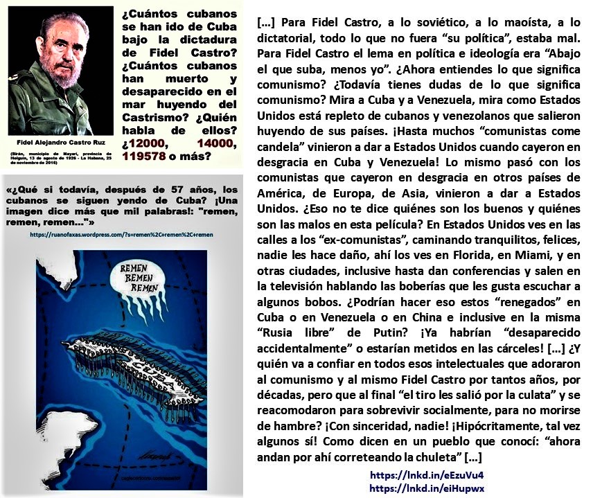 ← back to “PARTE DEL SEMINARIO: PAISOLOGÍA CUBANA E IMAGOLOGÍA CUBANA […] Cada año son miles los cubanos que se quieren ir de Cuba […] Unos logran llegar a Estados Unidos o a otro lugar, otros desaparecen en el mar, se mueren, se los comen los tiburones. ¿Y cuándo es que la gente se lanza a estas aventuras tan peligrosas como echarse al mar a ver qué pasa? ¡Cuando se está desesperado! ¡Cuando ya lo que queda es “la última opción”! ¿Cuántos son los cubanos muertos y desaparecidos en la dictadura de Fidel Castro? ¡Nadie sabe! ¿Quién sabe?: ¿12,000; 14,000; 119,578…? […] La huida de cubanos de Cuba es tan grande que no dudo que en esta estampida un día hasta los Castro quieran escapar de la Isla. Por eso todos los días miro hacia Cuba, porque pienso que es posible que llegue una balsa con Fidel Castro o Raúl, o su familia, y entonces, si tal fuera el caso, habría que gritarle a la gente que siempre ayuda: “No, a ésos no los rescaten, vuelvan a echar esa balsa al mar, y que la corriente marina se los lleve para allá, para Rusia, con Putin y los rusos”. ¡Bueno, y eso a ver si allá los quieren! […] Recordemos las palabras de José Martí: “¿Haremos los cubanos una revolución por el derecho, por la persona del hombre y su derecho total y negaremos, al día siguiente del triunfo, los derechos por que hemos batallado?” […] ¿Recuerdan ustedes las palabras que Fidel Castro dijo el 24 de abril de 1959? “Libertad con pan, pan sin terror”. La realidad es que en 57 años de Castrismo, en Cuba no ha habido pan y lo que ha sobrado y sigue sobrando es terror. ¿Alguien tiene alguna duda al respecto? Pregúntenle a los disidentes, a los opositores, que siguen viviendo dentro de Cuba: ¡UN INFIERNO! […] ¿Qué si el gobierno de Castro es un gobierno terrorista? ¡Claro que lo es! ¿Ya olvidaron ustedes lo que significa “Terrorismo de Estado”? […] Muchos dicen: “es que con Fidel Castro Cuba ha tenido muchos logros”. Es verdad: educación, medicina, deporte… Pero eso también lo han logrado muchos otros países, ¡y todavía han logrado muchísimo más!, países con excelentes calidad de vida, sin perseguir a sus ciudadanos, sin restringir las libertades de sus ciudadanos, sin establecer totalitarismo, dictadura, tiranía: Suecia, Dinamarca, Noruega, Finlandia, Suiza, Canadá, Australia, Alemania, Países Bajos […] ¿Y cómo subsiste Cuba? Gracias a las remesas que mandan todos estos hombres y mujeres que tuvieron que huir de la dictadura castrista, gracias a estos cubanos “disidentes”, gracias a estos cubanos “opositores”, a los que Castro y su pandilla han llamado “los gusanos”. Desde los mismos primeros años de la tiranía castrista, estos disidentes, opositores cubanos, que están regados por todo el mundo, pero que viven principalmente en Estados Unidos, han enviado de todo a Cuba: medicina, comida, ropa, pero sobre todo dinero, dólares […] En 2013 el total aproximado de estas remesas de dólares a Cuba desde Estados Unidos fue de 2,497,031,206 […] y aquí estamos hablando no de millones, sino de BILLONES, es decir millón de millones. Y esto, que conste, fue sólo el envío desde Estados Unidos, porque si sumamos el envío de todas las remesas de “los cubanos en el extranjero”, “los cubanos de afuera”, a Cuba, a “los cubanos de adentro”, entonces la cifra sería inmensísima: 2,777,363,411. ¿Ahora se entiende bien por qué y cómo subsisten Cuba y “los cubanos de adentro”? […] Claro, ahora los cubanos tenemos Internet, nos enteramos de todo al segundo, ya Castro y su pandilla no pueden manipularnos como les da gana. Y las cosas han cambiado para Cuba y los cubanos. Con esta visita de Obama a Cuba tenemos los cubanos nuevos horizontes, tenemos esperanzas concretas, en absolutamente todos los sentidos. Por ahora los cubanos de Cuba lo que queremos es trabajo y comida. “La libertad”, así como vamos, pronto llegará. Y con respecto a los cubanos republicanos o demócratas de la alta política de Estados Unidos que quieren que se mantenga el embargo, el bloqueo, a Cuba, ¡esta gente vive en el pasado!, ¡ya son como extraterrestres en este planeta!, y ahí tienen los resultados. La inmensa mayoría de los cubanos de Estados Unidos nunca votará por ellos en elecciones. ¿Marco Rubio, Ted Cruz, o cosa parecida, para presidente? ¡Ni soñarlo! ¡Pero si ahora Marco Rubio no ganó ni en su propio estado, Florida! ¡Y ya para qué hablar de personas como Bob Menéndez, Ros Lehtinen, Díaz Balart, Curbelo y semejantes!: “su carnaval pasó”, “ese disco se rayó” […]”