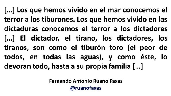 […] Los que hemos vivido en el mar conocemos el terror a los tiburones. Los que hemos vivido en las dictaduras conocemos el terror a los dictadores […] El dictador, el tirano, los dictadores, los tiranos, son como el tiburón toro (el peor de todos, en todas las aguas), y como éste, lo devoran todo, hasta a su propia familia […]