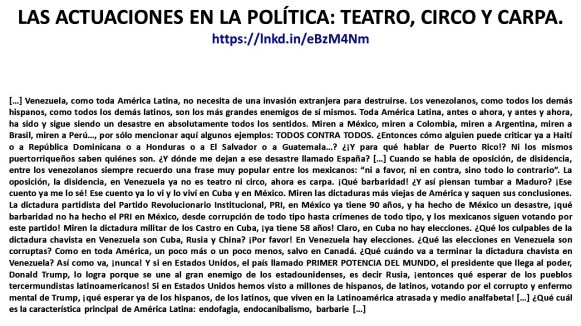 […] Venezuela, como toda América Latina, no necesita de una invasión extranjera para destruirse. Los venezolanos, como todos los demás hispanos, como todos los demás latinos, son los más grandes enemigos de sí mismos. Toda América Latina, antes o ahora, y antes y ahora, ha sido y sigue siendo un desastre en absolutamente todos los sentidos. Miren a México, miren a Colombia, miren a Argentina, miren a Brasil, miren a Perú…, por sólo mencionar aquí algunos ejemplos: TODOS CONTRA TODOS. ¿Entonces cómo alguien puede criticar ya a Haití o a República Dominicana o a Honduras o a El Salvador o a Guatemala…? ¿¡Y para qué hablar de Puerto Rico!? Ni los mismos puertorriqueños saben quiénes son. ¿Y dónde me dejan a ese desastre llamado España? […] Cuando se habla de oposición, de disidencia, entre los venezolanos siempre recuerdo una frase muy popular entre los mexicanos: “ni a favor, ni en contra, sino todo lo contrario”. La oposición, la disidencia, en Venezuela ya no es teatro ni circo, ahora es carpa. ¡Qué barbaridad! ¿Y así piensan tumbar a Maduro? ¡Ese cuento ya me lo sé! Ese cuento ya lo vi y lo viví en Cuba y en México. Miren las dictaduras más viejas de América y saquen sus conclusiones. La dictadura partidista del Partido Revolucionario Institucional, PRI, en México ya tiene 90 años, y ha hecho de México un desastre, ¡qué barbaridad no ha hecho el PRI en México, desde corrupción de todo tipo hasta crímenes de todo tipo, y los mexicanos siguen votando por este partido! Miren la dictadura militar de los Castro en Cuba, ¡ya tiene 58 años! Claro, en Cuba no hay elecciones. ¿Qué los culpables de la dictadura chavista en Venezuela son Cuba, Rusia y China? ¡Por favor! En Venezuela hay elecciones. ¿Qué las elecciones en Venezuela son corruptas? Como en toda América, un poco más o un poco menos, salvo en Canadá. ¿Qué cuándo va a terminar la dictadura chavista en Venezuela? Así como va, ¡nunca! Y si en Estados Unidos, el país llamado PRIMER POTENCIA DEL MUNDO, el presidente que llega al poder, Donald Trump, lo logra porque se une al gran enemigo de los estadounidenses, es decir Rusia, ¡entonces qué esperar de los pueblos tercermundistas latinoamericanos! Si en Estados Unidos hemos visto a millones de hispanos, de latinos, votando por el corrupto y enfermo mental de Trump, ¡qué esperar ya de los hispanos, de los latinos, que viven en la Latinoamérica atrasada y medio analfabeta! […] ¿Qué cuál es la característica principal de América Latina: endofagia, endocanibalismo, barbarie […]