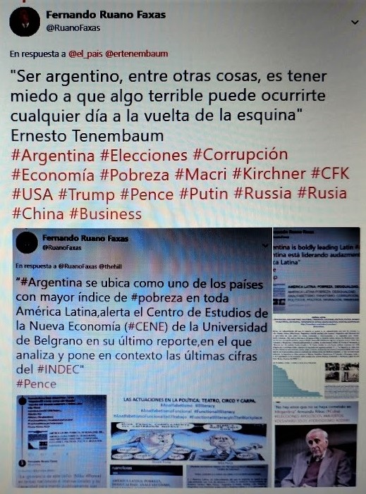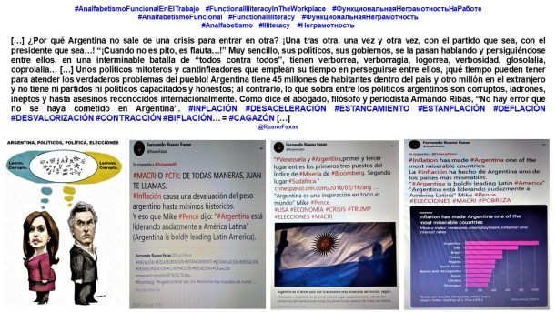 […] Y entonces me piden que haga diferencias entre Cristina Fernández de Kirchner CFK y Mauricio Macri. ¿Acaso alguien puede hacer diferencias entre la mierda y la cagada? Como dice ese filósofo cubano brillante Armando Ribas, que, “para variar”, en Cuba nadie conoce y los cubanos de Estados Unidos tampoco: “No hay error que no se haya cometido en Argentina” […] Argentina sigue metida en el hueco, no hay manera de que pueda salir adelante. Hoy con Macri Argentina sigue teniendo problemas terribles, se ubica como uno de los países con mayor índice de pobreza en toda América Latina, según el Centro de Estudios de la Nueva Economía (CENE) de la Universidad de Belgrano en su último reporte, en el que analiza y pone en contexto las últimas cifras del INDEC (Instituto Nacional de Estadística y Censos). Y dice Bloomberg que Argentina es el tercer país con la economía más miserable del mundo, junto a Sudáfrica y Venezuela. Y entonces este vicepresidente ignorante de Estados Unidos Mike Pence anda diciendo por ahí que “Argentina está liderando audazmente a América Latina” (Argentina is boldly leading Latin America). ¿Pero por qué estos políticos imbéciles manipulan tan fácilmente al pueblo? Muy fácil. Si en Estados Unidos, país llamado PRIMER POTENCIA DEL MUNDO, hay 90 millones de seres humanos con algún tipo de analfabetismo evidente, comprobable, grave, ¡imagínense en qué situación estarán estos pueblos de América Latina!, y más, ¡imagínense en qué situación informativa estarán estos pueblos en donde la censura y la autocensura están a la orden del día y la gente difícilmente puede informarse adecuadamente de las cosas que pasan en el mundo, y si se las explicas entonces no hay manera de que puedan entenderla adecuadamente. Si mientras el mundo se está cayendo hay gente que se la pasa todos los días hablando y escribiendo estupideces de religión y dios y la virgen y todos los santos y la corte celestial completa, con un nivel de fanatismo patológico, enfermizo, en pleno siglo XXI de desarrollo de Internet y las redes sociales, ¡qué se puede esperar ya en cuanto a conciencia política, compromiso social y participación en elecciones gubernamentales! Con estos niveles de ignorancia y fanatismo, estamos, literalmente hablando, jodidos. ¡Qué tristeza! ¡Qué pena! Como se dice por ahí: “¡Ni cómo ayudarlos!” […]