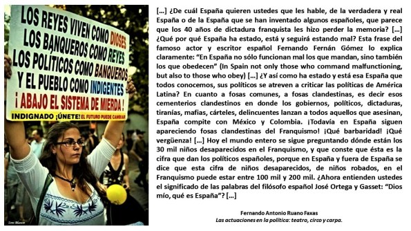 […] ¿De cuál España quieren ustedes que les hable, de la verdadera y real España o de la España que se han inventado algunos españoles, que parece que los 40 años de dictadura franquista les hizo perder la memoria? […] ¿Qué por qué España ha estado, está y seguirá estando mal? Esta frase del famoso actor y escritor español Fernando Fernán Gómez lo explica claramente: “En España no sólo funcionan mal los que mandan, sino también los que obedecen” (In Spain not only those who command malfunctioning, but also to those who obey) […] ¿Y así como ha estado y está esa España que todos conocemos, sus políticos se atreven a criticar las políticas de América Latina? En cuanto a fosas comunes, a fosas clandestinas, es decir esos cementerios clandestinos en donde los gobiernos, políticos, dictaduras, tiranías, mafias, cárteles, delincuentes lanzan a todos aquellos que asesinan, España compite con México y Colombia. ¡Todavía en España siguen apareciendo fosas clandestinas del Franquismo! ¡Qué barbaridad! ¡Qué vergüenza! […] Hoy el mundo entero se sigue preguntando dónde están los 30 mil niños desaparecidos en el Franquismo, y que conste que ésta es la cifra que dan los políticos españoles, porque en España y fuera de España se dice que esta cifra de niños desaparecidos, de niños robados, en el Franquismo puede estar entre 100 mil y 200 mil. ¿Ahora entienden ustedes el significado de las palabras del filósofo español José Ortega y Gasset: “Dios mío, qué es España”? […]