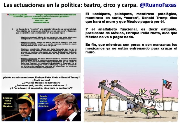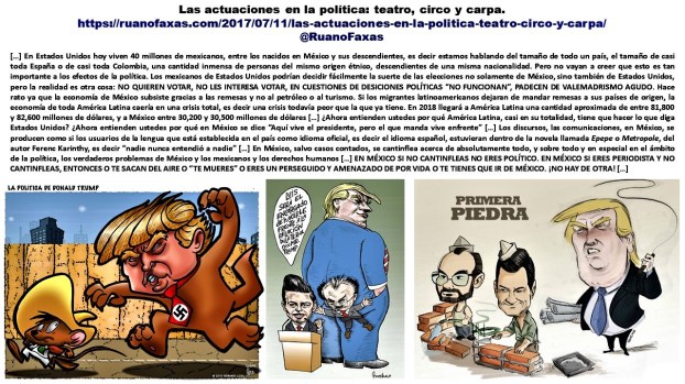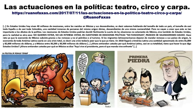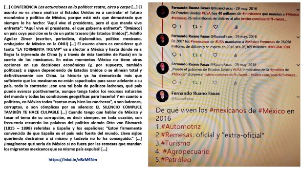 […] CONFERENCIA Las actuaciones en la política: teatro, circo y carpa […] El asunto no es ahora analizar si Estados Unidos va a controlar el futuro económico y político de México, porque está más que demostrado que siempre lo ha hecho: “Aquí vive el presidente, pero el que manda vive enfrente”; “Aquí vive el presidente, el que gobierna enfrente”; “[México] un país cuya posición es la de un patio trasero [de Estados Unidos]”, Adolfo Aguilar Zínser (escritor, periodista, diplomático, político mexicano, embajador de México en la ONU) […] El asunto ahora es considerar qué tanto “LA TORMENTA TRUMP” va a afectar a México y hasta dónde va a llegar la injerencia de China (y a través de ésta también de Rusia) en la suerte de los mexicanos. En estos momentos México no tiene otras opciones en sus decisiones económicas (y, por supuesto, también políticas): o siguen dependiendo de Estados Unidos o se alinean total y definitivamente con China. La historia ya ha demostrado más que suficiente que los mexicanos no están capacitados para sacar adelante a su país, todo lo contrario: ¡con una tal bola de políticos ladrones, qué país puede avanzar positivamente, aunque tenga todos los recursos naturales del mundo y todas las condiciones geográficas para hacerlo! Y en cuanto a políticos, en México todos “cantan muy bien las rancheras”, o son ladrones, corruptos, o son cómplices por su silencio: EL SILENCIO CÓMPLICE TAMBIÉN TE HACE CULPABLE […] Cuando tengo que hablar de México y tocar el tema de su corrupción, es decir siempre, en toda ocasión, con frecuencia recuerdo las palabras del político alemán Otto von Bismarck (1815 – 1898) referidas a España y los españoles: “Estoy firmemente convencido de que España es el país más fuerte del mundo. Lleva siglos queriendo destruirse a sí mismo y todavía no lo ha conseguido.” […] ¡Imagínense qué sería de México si no fuera por las remesas que mandan los migrantes mexicanos que su mismo país expulsó! […]
