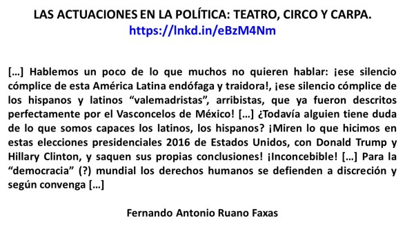 […] Hablemos un poco de lo que muchos no quieren hablar: ¡ese silencio cómplice de esta América Latina endófaga y traidora!, ¡ese silencio cómplice de los hispanos y latinos “valemadristas”, arribistas, que ya fueron descritos perfectamente por el Vasconcelos de México! […] ¿Todavía alguien tiene duda de lo que somos capaces los latinos, los hispanos? ¡Miren lo que hicimos en estas elecciones presidenciales 2016 de Estados Unidos, con Donald Trump y Hillary Clinton, y saquen sus propias conclusiones! ¡Inconcebible! […] Para la “democracia” (?) mundial los derechos humanos se defienden a discreción y según convenga […]