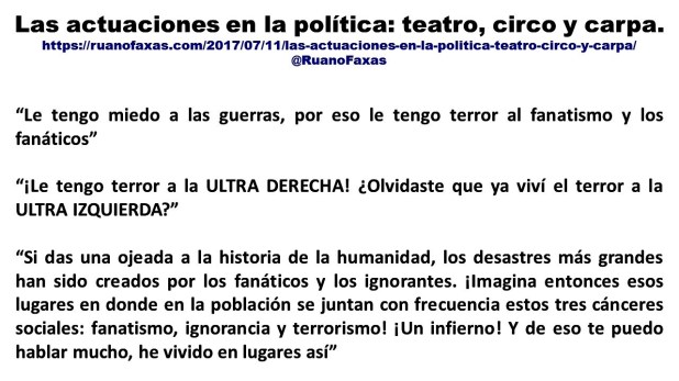 […] Y con los años que he vivido, y con los países en los que he vivido, y con lo que he visto y experimentado en carne propia, ya no tengo ninguna duda acerca de que la política es una mierda […] Claro, dentro de la política hay sus categorías, dentro de la política hay teatro, circo y carpa, dependiendo de la condición humana, de los valores, del nivel de civismo, de la región o del país o del pueblo de que se trate […] Recuerden que en lo que respecta al mundo de los espectáculos artísticos, en lo que respecta a la actuación artística, en cuanto a categoría de actuación, por relevancia y trascendencia, primero está el teatro, después el circo y finalmente la carpa. La política como teatro aparece en los países más civilizados, más desarrollados, en donde casi generalmente da gusto ver todo ese proceso de elección de los políticos, de los estadistas, de los gobernantes, y más aún, da gusto ver sus desempeños; aquí mencionamos a países como Suecia, Dinamarca, Noruega, Finlandia, Holanda, Austria, Australia, Alemania… […]
