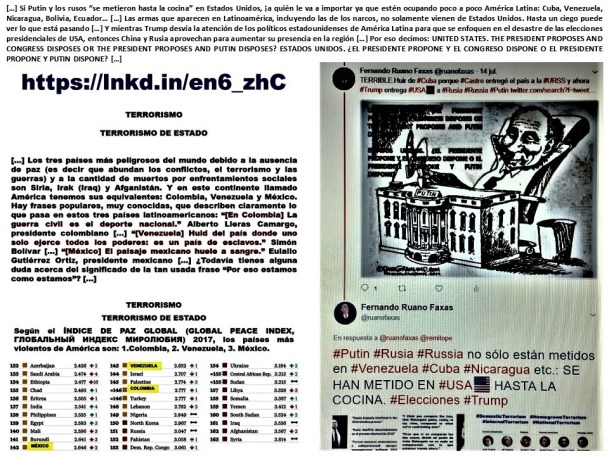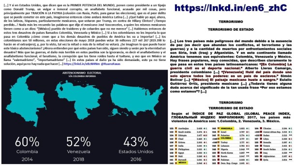 […] Y si en Estados Unidos, que dicen que es la PRIMER POTENCIA DEL MUNDO, ponen como presidente a un tipejo como Donald Trump, un vulgar e inmoral corrupto, un analfabeto funcional, acusado por mil cosas, pero principalmente por TRAICIÓN A LA PATRIA (colusión con Rusia, Putin, para ganar las elecciones), que es el peor delito que se puede cometer en este país, imagínense entonces cómo andará América Latina […] ¿Qué hable yo aquí, ahora, de los latinos, hispanos, particularmente mexicanos, que votaron por Trump, en contra de Hillary Clinton? ¡Tiempo perdido…! Nada más les recuerdo las palabras que dijo el mexicano José Vasconcelos, a quien los mismos mexicanos tienen como a un dios: “[México] pueblo de traidores y de cobardes que no me merece” […] Hablemos entonces de estos tres desastres de países llamados Colombia, Venezuela y México […] Si a los colombianos no les importa lo que pasa en Colombia ¡cómo creen que a los demás desastres de pueblos de América les va a importar! […] los colombianos son 50 millones, en estas elecciones de mayo 2018 pueden votar 36 millones 227 mil 267 (819.398 lo harán en el extranjero), y, por lo visto, tal vez la mitad o más de la mitad no votará. ¿Se imaginan lo que puede hacer este tóxico abstencionismo? ¿Ahora entienden por qué estos países han sido, siguen siendo y serán por la eternidad un desastre? Más que las guerras, el daño más terrible en estos pueblos son la ignorancia, es decir el analfabetismo y el analfabetismo funcional, el fanatismo, la corrupción que los tiene roídos hasta el tuétano, y eso que en México se llama “valemadrismo”, “importamadrismo” […] En estos países el daño ya ha sido demasiado, esto ya no tiene solución, aquí ya no hay nada que hacer […]
