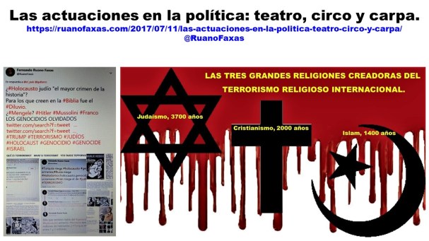 […] Sí, en realidad, “¡pobre España!” Mucha gente me ha hablado de esta conferencia, que ya es muy vieja: “Las actuaciones en la política: teatro, circo y carpa” […] Y estos países han ido empeorando cada vez más, una y otra vez, ante los ojos de todos, a la vista de todos. ¡Y eso que hace mucho tiempo ya que tenemos Internet y que todo se sabe al segundo, en el mundo entero, en todos los idiomas! Hasta los ciegos podían ver que todas estas barbaridades que pasaban en estos países no podían conducir a otro lugar que no fuera el abismo socio-económico, el abismo socio-político: ¡ahí están los resultados de tanta corrupción, de tanta impunidad y de tanto silencio cómplice! […] ¿Qué otros resultados sino LOS DESASTRES pueden tener los pueblos dirigidos por políticos imbéciles, idiotas, incultos, corruptos, que a su vez son elegidos por votantes analfabetos funcionales y hasta analfabetos totales, por votantes enfermos de religiones de todo tipo, fanáticos, que, por cierto, no entienden ni un carajo de lo que se dice en los textos sagrados, en las sagradas escrituras, se trate de la religión que sea o de la creencia que sea? […] ¿Recuerdan las palabras de José Saramago?: “Somos la memoria que tenemos y la responsabilidad que asumimos, sin memoria no existimos y sin responsabilidad quizá no merezcamos existir […] Es hora de aullar, porque si nos dejamos llevar por los poderes que nos gobiernan, y no hacemos nada por contrarrestarlos, se puede decir que nos merecemos lo que tenemos […] no esperaba reacciones de los católicos [acerca de este libro CAÍN] porque ellos [los católicos] no leen la Biblia […] ¿Quién va a leer un libro de ese tamaño?” […] ¿Recuerdan el refrán “De tal palo, tal astilla”? Aplíquenlo a las elecciones, a los políticos, a los electores, a los votantes: POR EL PRESTIGIO Y LA MORAL DE LOS POLÍTICOS SACA TUS CONCLUSIONES ACERCA DEL PRESTIGIO Y LA MORAL DE SUS ELECTORES […] ¿Y quiénes son más culpables de los desastres de los pueblos, los malos políticos o los votantes cómplices que los eligen? ¿Recuerdan las palabras del político francés Joseph de Maistre?: “Cada nación tiene el gobierno que se merece.” […] ¿Por qué muchos jóvenes españoles dicen: “Si acabas una carrera en España tienes 3 salidas: 1. Por tierra, 2. Por mar, 3. Por aire”? […] ¿Por qué en el mundo desarrollado cuando se refieren a Portugal, Italia, Grecia y España (Spain) hablan de los “PIGS” (“cerdos”, “marranos”, “puercos”)? […] ¿Cómo explicar que España, un país con tantos siglos de historia universal trascendental en todos los sentidos, sea “el único gran país rico sin universidades entre las 200 mejores del mundo”? ¿Y por qué Estados Unidos, un país que “apareció ayer en el plano internacional”, tiene las mejores universidades del mundo? Todos conocemos perfectamente la explicación a esto: LA GRAN CORRUPCIÓN […] En fin, que repito mis palabras: “¡Pobre España!” […]