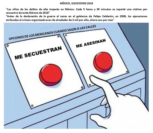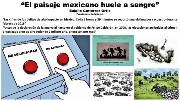 […] AL EJÉRCITO DE ESTADOS UNIDOS SE LE ACUSA DE INVADIR A OTROS PAÍSES, DE MATAR A EXTRANJEROS […] AL EJÉRCITO DE MÉXICO SE LE ACUSA DE MATAR A LOS MISMOS MEXICANOS, EN ESPECIAL A ESTUDIANTES, A MAESTROS, A INDÍGENAS, A POBRES: TLATELOLCO, TLATLAYA, AYOTZINAPA, ACTEAL, AGUAS BLANCAS, SAN FERNANDO, ATENCO, APATZINGÁN, OSTULA, NOCHIXTLÁN… […] “EL PAISAJE MEXICANO HUELE A SANGRE” […] A MÉXICO LO HA MATADO EL PRI Y EL TIRO DE GRACIA SE LO HAN DADO PAN, PRD, PVEM, PT, PANAL, MC (MOVIMIENTO CIUDADANO), ES (ENCUENTRO SOCIAL) […] EL SILENCIO CÓMPLICE TAMBIÉN TE HACE CULPABLE […]