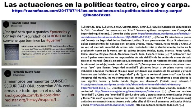 […] Pero empecemos aquí hablando de ese “fraude” llamado ONU […] May 28, 2012 […] SIRIA, SYRIA, СИРИЯ, HULA, ХУЛА […] ¿¡Qué el Consejo de Seguridad de la ONU “condena” las masacres en Siria!? Veamos quiénes componen ese Consejo de Seguridad y qué hacen […] Como he dicho ya en https://ruanofaxas.wordpress.com/article/si-consideramos-los-alcances-de-la-onu-19j6x763f3uf8-110-2/ […] De los 15 miembros o países del Consejo de Seguridad de las Naciones Unidas, 5 son permanentes. Estos 5 miembros o países permanentes del Consejo son: Estados Unidos, Rusia, Francia, Reino Unido y China. A su vez, el mercado mundial de armas está controlado total y absolutamente, tanto en la producción como en la venta, por 13 países: Estados Unidos, Rusia, Francia, Reino Unido, China, Austria, Bélgica, Brasil, Alemania, Israel, Italia, España y Suiza […] ¡Y justamente son estos 5 países mencionados los responsables de más del 80% de las ventas de armas de todo tipo en el mundo! ¡Ésta es, en principio, la verdadera cara de las Naciones Unidas! ¿No es ésta la más cruel paradoja, la más cruel contradicción? ¿Cómo poner en las manos de países como estos “eso” que llaman “seguridad mundial”? ¿Estamos locos o de plano somos todos imbéciles o tarados mentales? ¿Es que acaso olvidamos que muchos de los estados y grupos humanos que hablan tanto de “seguridad” y de “guerra contra el terrorismo” son los más inseguros del mundo, los más terroristas del mundo? ¿Es que no sabemos a estas alturas lo que significa terror y hasta dónde llegan sus alcances?: ¡‘miedo muy intenso’…! https://ruanofaxas.wordpress.com/article/abordando-el-tema-del-miedo-el-temor-y-19j6x763f3uf8-140-2/ […] ¿Control de armas, control de armamentos? ¿Dónde, cuándo? ¡Al contrario! http://www.un-register.org/HeavyWeapons/Index.aspx […] ¿Desarme nuclear “mundial”? ¿¡Cómo que “mundial”!? ¡Será, sobre todo y especialmente, entre Estados Unidos y Rusia! “Se cree” que hoy tenemos en todo el mundo unas 25 mil ó 27 mil (o muchas más) unidades armamentísticas nucleares, y de todas ellas el 95% está en manos de Estados Unidos y Rusia http://radio.uchile.cl/afondo/63828/ . ¿De qué se trata entonces todo esto? […] SIRIA, SYRIA, СИРИЯ, HULA, ХУЛА سوريا الحولة ¿¡Qué el Consejo de Seguridad de la ONU “condena” las masacres en Siria!? Veamos quiénes componen ese Consejo de Seguridad y qué hacen