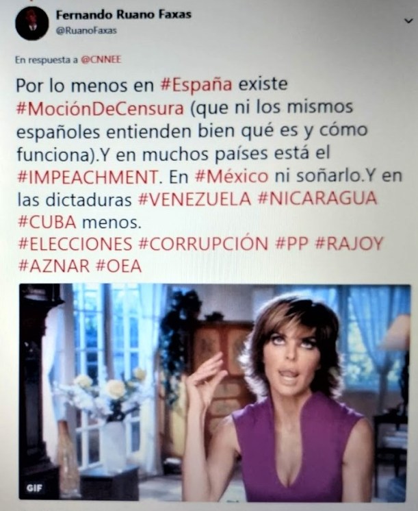 “Esos políticos (?) burros como Donald #Trump, Enrique Peña Nieto #EPN #PeñaNieto, Vicente Fox #VicenteFox #FOX, Nicolás #Maduro, Raúl #Castro, Daniel #Ortega […] no escriben sus (?) libros, los escriben los llamados #ghostwriter, escritor fantasma #EscritorFantasma #NegroLiterario, nègre littéraire #NègreLittéraire, prête-plume #PrêtePlume, литературный негр #ЛитературныйНегр […] ¿¡Cómo van a escribir libros individuos que para el mundo verdaderamente culto, verdaderamente ilustrado, no saben leer, no saben escribir, que son, literal y claramente hablando, analfabetos funcionales!? Pero claro, ¿quiénes son los seguidores de tipos como éstos?, ¿quiénes son los que votan por tipos como éstos? Nada más véanlos, mírenlos, óiganlos hablar, observen sus gestos y ademanes, y saquen sus conclusiones: POR EL PRESTIGIO Y LA MORAL DE LOS POLÍTICOS SACA TUS CONCLUSIONES ACERCA DEL PRESTIGIO Y LA MORAL DE SUS ELECTORES”
