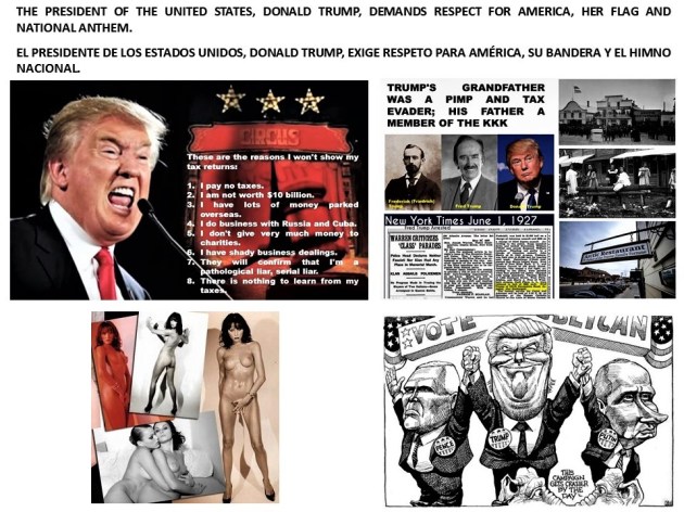 […] ¿Y quién me dice que la política del Vaticano no se incluye en esta categoría de política-carpa, de política carpera? ¿Alguna duda a estas alturas? ¿VATICANO O LA JAULA DE LAS LOCAS? VATICAN OR THE BIRDCAGE? ВАТИКАН ИЛИ КЛЕТКА ДЛЯ ПТАШЕК? […] Siempre pensé que en cuanto a política los Estados Unidos estaba en la categoría de POLÍTICA-TEATRO, y que algunas veces, muy pocas, entraba en la categoría de POLÍTICA-CIRCO, pero ahora viendo lo que ha pasado en estas elecciones presidenciales del 2016, y los escándalos de todo tipo que siguen a la orden del día, y que Donald Trump se alió evidentemente al enemigo histórico de los estadounidenses que es Rusia (Putin), entonces no tengo la menor duda acerca de que hoy la política estadounidense es POLÍTICA-CARPA: I. Donald Trump en imágenes. Donald Trump in pictures. Donald Trump em imagens. Дональд Трамп в картинках. , II. Donald Trump en imágenes. Donald Trump in pictures. Donald Trump em imagens. Дональд Трамп в картинках. […] ¡Qué pena que esto pase en Estados Unidos, el país que durante tanto tiempo fue llamado LA PRIMER POTENCIA DEL MUNDO! ¡Cuántos trapos sucios se han sacado al sol los políticos de Estados Unidos! ¡Qué barbaridades no ha dicho Donald Trump en las redes, en especial en Twitter, en contra de todos y de todas, parejo, algo así como un TODOS CONTRA TODOS! Nunca imaginé ver el día en que Estados Unidos se convertiría en el hazmerreír del mundo entero, que Estados Unidos fuera la burla inclusive de los tercermundistas y cuartomundistas, inclusive de los “quintomundistas” (?) […] Si Putin y los rusos “se metieron hasta la cocina” en Estados Unidos, ¡a quién le va a importar ya que estén ocupando poco a poco América Latina: Cuba, Venezuela, Nicaragua, Bolivia, Ecuador… […] Las armas que aparecen en Latinoamérica, incluyendo las de los narcos, no solamente vienen de Estados Unidos. Hasta un ciego puede ver lo que está pasando […] Y mientras Trump desvía la atención de los políticos estadounidenses de América Latina para que se enfoquen en el desastre de las elecciones presidenciales de USA, entonces China y Rusia aprovechan para aumentar su presencia en la región […] Por eso decimos: UNITED STATES. THE PRESIDENT PROPOSES AND CONGRESS DISPOSES OR THE PRESIDENT PROPOSES AND PUTIN DISPOSES? ESTADOS UNIDOS. ¿EL PRESIDENTE PROPONE Y EL CONGRESO DISPONE O EL PRESIDENTE PROPONE Y PUTIN DISPONE? […] ¿Y así Estados Unidos de América dice que es la PRIMER POTENCIA DEL MUNDO? Creo que aquí hay “un malentendido”. […]