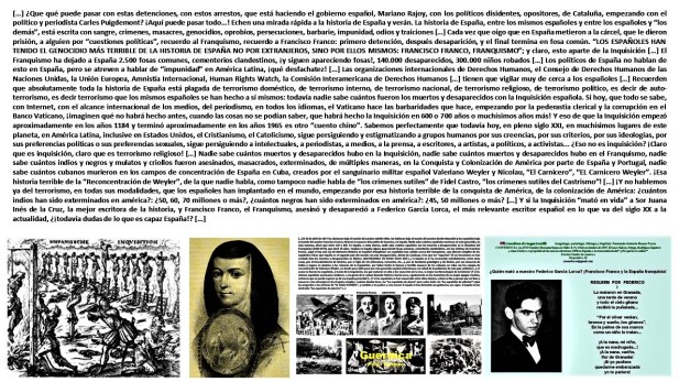 […] España, un país con una historia interminable de perseguidores y perseguidos, en un todos contra todos en ríos de sangre y dolor. Solamente esas historias de terror y barbarie, ese interminable terrorismo doméstico español, que están relacionados con la iglesia y Francisco Franco, es suficiente para la eterna vergüenza de España y los españoles cómplices. Y así los políticos españoles se atreven a venir a hablar en América acerca de derechos y elecciones, ¡qué cara más dura tienen estos cabrones! […]