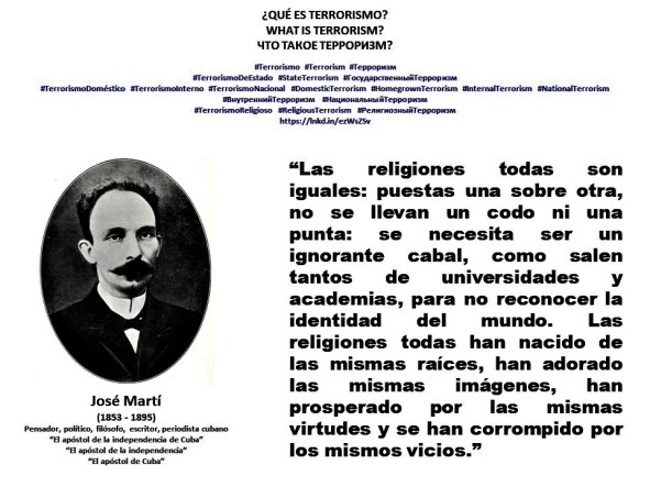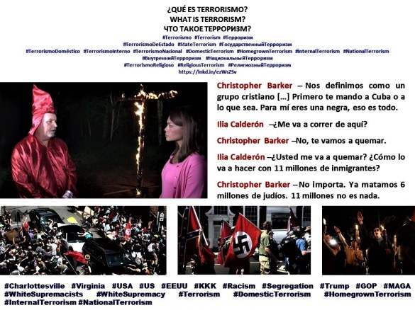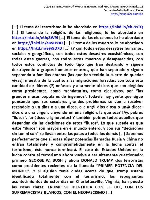 […] El tema del terrorismo lo he abordado en https://lnkd.in/eh-9sTQ […] El tema de la religión, de las religiones, lo he abordado en https://lnkd.in/eUq3W9i […] El tema de las elecciones lo he abordado en https://lnkd.in/eKvHs9U […] El tema de los muertos lo he abordado en https://lnkd.in/ejy9D7D […] ¿Y con todos estos desastres humanos, sociales y geográficos, con todos estos desastres ecosistémicos, con todas estas guerras, con todos estos muertos y desaparecidos, con todos estos conflictos de todo tipo que han destruido y siguen destruyendo a grupos humanos enteros, que han separado y siguen separando a familias enteras (las que han tenido la suerte de quedar vivas), muestra de lo cual son las migraciones forzadas, con toda esta cantidad de líderes nefastos y altamente tóxicos que son elegidos como presidentes, como mandatarios, por “las grandes masas populares de ingenuos”, todavía hay gente que sigue pensando que sus grandes problemas se van a resolver rezándole a un dios o a una diosa, o a un@ dios-diosa o un@ diosa-dios o a una virgen, creyendo en una religión, la que sea? ¡Ay, pobres “ilusos”, fanáticos e ignorantes! Y también pobres todos aquellos que dependan de las decisiones de estos “ilusos”. Lo que sucede es que estos “ilusos” son mayoría en el mundo entero, y con sus “decisiones sin ton ni son” se llevan entre las patas a todos los demás […] Sabemos perfectamente que si estas súper potencias llamadas Rusia y China no entran totalmente y comprometidamente en la lucha contra el terrorismo, éste nunca terminará. El caso de Estados Unidos en la lucha contra el terrorismo ahora vuelve a ser altamente cuestionado: primero GEORGE W. BUSH y ahora DONALD TRUMP, dos terroristas como presidentes recientes de la llamada “PRIMER POTENCIA DEL MUNDO”. Y si alguien tenía dudas acerca de que Trump estaba identificado totalmente con el terrorismo, los repugnantes acontecimientos de estos días en Charlottesville, Virginia, han puesto las cosas claras: TRUMP SE IDENTIFICA CON EL KKK, CON LOS SUPREMACISTAS BLANCOS, CON EL NEOFASCISMO […]
