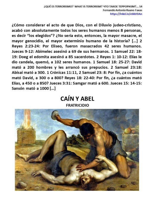 Miren estas relaciones (?) entre los países de América Latina y saquen sus conclusiones: “Cuando no están presos, los andan buscando”. ¿Acabar con el terrorismo religioso? ¡Habría que acabar con la inmensa mayoría de las más de 10 mil religiones del mundo, empezando por las corruptas, lo que es SECRETO A VOCES! ¿Quiénes han sido y siguen siendo los líderes del terrorismo religioso a nivel mundial? Las religiones abrahamánicas: JUDAÍSMO, CRISTIANISMO, ISLAM. Judíos contra cristianos y musulmanes, cristianos contra judíos y musulmanes, musulmanes contra judíos y cristianos, protestantes contra católicos, católicos contra protestantes, protestantes contra protestantes, cristianos contra cristianos, católicos contra católicos, musulmanes contra musulmanes, en especial Sunismo contra Chiismo y viceversa… ¡interminable! ¡Pero qué es esto! ¿Religiones abrahamánicas o un todos contra todos en el terrorismo religioso abrahamánico? ¿34.000 grupos cristianos o sectas del cristianismo? ¿Para qué tantas? ¿Rusia con 146 millones de habitantes y de éstos 17 millones son musulmanes, y más de 8 mil mezquitas? ¿Francia con 67 millones de habitantes y de éstos 6 millones son musulmanes y cada año 4.000 franceses se convierten al Islam, y 60%-70% de los presos en Francia son musulmanes? “¡Aquí hay gato encerrado, y el gato es grande!” […] ¿Tan sólo en México 8 mil 54 asociaciones religiosas y más de 1000 sectas? ¿No que todo México era católico y guadalupano? […] ¿Qué países como Brasil, Cuba… son católicos? ¡Por favor, si en estos países de América Latina la santería, la brujería, los cultos alternativos, están a la orden del día y ante los ojos de todo el que quiera y pueda ver! Y todos estos grupos religiosos “compiten” entre ellos por “el jugoso mercado religioso”, y esta “competencia religiosa” en muchos casos se pone fea, es decir se persiguen, se hostigan, se amenazan, se “bulean”, se agreden, se matan unos a otros. Cuando quieran buscar ejemplos de terrorismo en América Latina, no vayan muy lejos, ahí está México, en este país son evidentes todos los tipos de terrorismo, y muy a la orden, todos los días, un poco más o un poco menos […] ¿Acaso hay algún lugar de este planeta que no haya sido víctima del terrorismo abrahamánico? ¿Ya olvidaron, por ejemplo, el famoso diluvio universal? […] Hablemos entonces de las masacres, de los genocidios, de los crímenes, de los asesinatos, de las ejecuciones […] en la Biblia judeo-cristiana. ¿Cómo considerar el acto de que Dios, con el Diluvio judeo-cristiano, acabó con absolutamente todos los seres humanos menos 8 personas, es decir “los elegidos”? ¿No sería esto, entonces, la mayor masacre, el mayor genocidio, el mayor exterminio humano de la historia? […] 2 Reyes 2:23-24: Por Eliseo, fueron masacrados 42 seres humanos. Jueces 9-12: Abimelec asesinó a 69 de sus hermanos. 1 Samuel 22: 18-19: Doeg el edomita asesinó a 85 sacerdotes. 2 Reyes 1: 10-12: Elías le dio candela, quemó, a 102 seres humanos. 1 Samuel 18: 25-27: David mató a 200 hombres y les arrancó sus prepucios. 2 Samuel 23:18: Abisai mató a 300. 1 Crónicas 11:11, 2 Samuel 23: 8: Por fin, ¿a cuántos mató David, a 300 o a 800? Reyes 18: 22-40: Por fin, ¿a cuántos mató Elías, a 450 o a 850? Jueces 3:31: Samgar mató a 600. Jueces 15: 14-15: Sansón mató a 1000 […] Y nosotros los humanos no hacemos terrorismo interplanetario porque todavía no hemos encontrado a los extraterrestres, pero en cuanto los encontremos, ¡pobres de ellos, lo que les espera!: TERRORISMO ESPACIAL, TERRORISMO INTERPLANETARIO, TERRORISMO INTERGALÁCTICO […] Claro, también todos sabemos que a estos países que son los colosos del mercado de armas a nivel mundial no les conviene acabar con el terrorismo. ¿De dónde salen las armas que emplean los terroristas en el mundo entero, incluyendo aquí a los temidos terroristas mexicanos del narcotráfico mundial? El mercado mundial de armas está controlado total y absolutamente, tanto en la producción como en la venta, por 13 países: Estados Unidos, Rusia, Francia, Reino Unido, China, Austria, Bélgica, Brasil, Alemania, Israel, Italia, España y Suiza […] Y, lo peor de todo esto, es que el Consejo de Seguridad de las Naciones Unidas, tiene 5 miembros permanentes “líderes” en el mercado armamentístico: Estados Unidos, Rusia, Francia, Reino Unido y China. ¡Y justamente son estos 5 países mencionados los responsables de más del 80% de las ventas de armas de todo tipo en el mundo! ¡Ésta es, en principio, la verdadera cara de las Naciones Unidas! ¿No es ésta la más cruel paradoja, la más cruel contradicción? ¿Cómo poner en las manos de países como estos “eso” que llaman “seguridad mundial”? ¿Estamos locos o de plano somos todos imbéciles o tarados mentales? ¿Es que acaso olvidamos que muchos de los estados y grupos humanos que hablan tanto de “seguridad” y de “guerra contra el terrorismo” son los más inseguros del mundo, los más terroristas del mundo? ¿Es que no sabemos a estas alturas lo que significa terror y hasta dónde llegan sus alcances?: ¡‘miedo muy intenso’…! […]