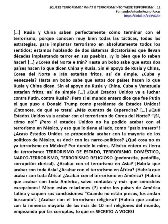 ¿Qué Estados Unidos va a luchar contra Putin, contra Rusia? ¡Pero si el mundo entero dice que fue Putin el que puso a Donald Trump como presidente de Estados Unidos! ¡Entonces, de qué se trata! ¿Más cuentos de Caperucita? […] ¿Qué Estados Unidos va a acabar con el terrorismo de Corea del Norte? “¡Sí, cómo no!” ¡Pero si estados Unidos no ha podido acabar con el terrorismo en México, y eso que lo tiene al lado, como “patio trasero”! ¿Acaso Estados Unidos se propondría acabar con la mayoría de los políticos de México, es decir con los narco-políticos? ¿Qué cosa no es ya terrorismo en México? Por donde lo mires, México entero es tierra de terrorismo: TERRORISMO DE ESTADO, TERRORISMO DOMÉSTICO, NARCO-TERRORISMO, TERRORISMO RELIGIOSO (pederastia, pedofilia, corrupción clerical). ¿Acabar con el terrorismo en Asia? ¡Habría que acabar con toda Asia! ¿Acabar con el terrorismo en África? ¡Habría que acabar con toda África! ¿Acabar con el terrorismo en América? ¡Habría que acabar con toda América, salvo contadas y más que conocidas excepciones!