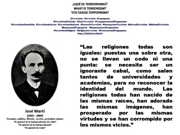 […] No hay un momento de la historia mundial en el que no estén presentes las religiones, casi siempre para mal, pocas veces para bien. Como decía José Martí: “No vayas a enseñar este libro al cura de tu pueblo; porque a él le interesa mantenerte en la oscuridad; para que todo tengas que ir a preguntárselo a él […] Y como es una injusticia que se explote así tu ignorancia, yo, que no te cobro nada por mi libro, quiero, hombre del campo, hablar contigo para decirte la verdad […] Ese dios que regatea, que vende la salvación, que todo lo hace en cambio de dinero, que manda las gentes al infierno si no le pagan, y si le pagan las manda al cielo, ese dios es una especie de prestamista, de usurero, de tendero. No, amigo mío, ¡hay otro Dios!” “Las religiones todas han nacido de las mismas raíces, han adorado las mismas imágenes, han prosperado por las mismas virtudes y se han corrompido por los mismos vicios.” […]