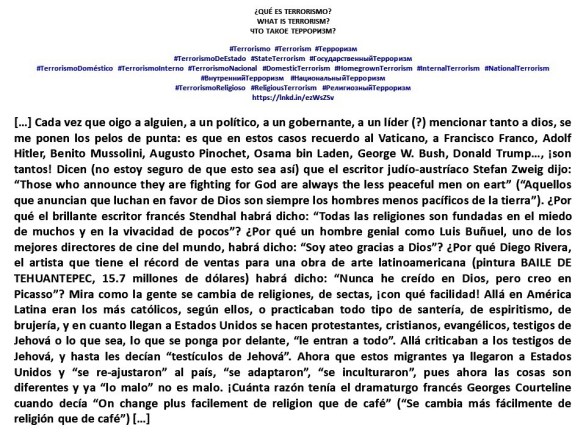 […] Cada vez que oigo a alguien, a un político, a un gobernante, a un líder (?) mencionar tanto a dios, se me ponen los pelos de punta: es que en estos casos recuerdo al Vaticano, a Francisco Franco, Adolf Hitler, Benito Mussolini, Augusto Pinochet, Osama bin Laden, George W. Bush, Donald Trump…, ¡son tantos! Dicen (no estoy seguro de que esto sea así) que el escritor judío-austríaco Stefan Zweig dijo: “Those who announce they are fighting for God are always the less peaceful men on eart” (“Aquellos que anuncian que luchan en favor de Dios son siempre los hombres menos pacíficos de la tierra”). ¿Por qué el brillante escritor francés Stendhal habrá dicho: “Todas las religiones son fundadas en el miedo de muchos y en la vivacidad de pocos”? ¿Por qué un hombre genial como Luis Buñuel, uno de los mejores directores de cine del mundo, habrá dicho: “Soy ateo gracias a Dios”? ¿Por qué Diego Rivera, el artista que tiene el récord de ventas para una obra de arte latinoamericana (pintura BAILE DE TEHUANTEPEC, 15.7 millones de dólares) habrá dicho: “Nunca he creído en Dios, pero creo en Picasso”? Mira como la gente se cambia de religiones, de sectas, ¡con qué facilidad! Allá en América Latina eran los más católicos, según ellos, o practicaban todo tipo de santería, de espiritismo, de brujería, y en cuanto llegan a Estados Unidos se hacen protestantes, cristianos, evangélicos, testigos de Jehová o lo que sea, lo que se ponga por delante, “le entran a todo”. Allá criticaban a los testigos de Jehová, y hasta les decían “testículos de Jehová”. Ahora que estos migrantes ya llegaron a Estados Unidos y “se re-ajustaron” al país, “se adaptaron”, “se inculturaron”, pues ahora las cosas son diferentes y ya “lo malo” no es malo. ¡Cuánta razón tenía el dramaturgo francés Georges Courteline cuando decía “On change plus facilement de religion que de café” (“Se cambia más fácilmente de religión que de café”) […]