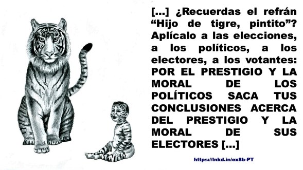 […] ¿Recuerdas el refrán “Hijo de tigre, pintito”? Aplícalo a las elecciones, a los políticos, a los electores, a los votantes: POR EL PRESTIGIO Y LA MORAL DE LOS POLÍTICOS SACA TUS CONCLUSIONES ACERCA DEL PRESTIGIO Y LA MORAL DE SUS ELECTORES […]