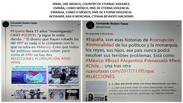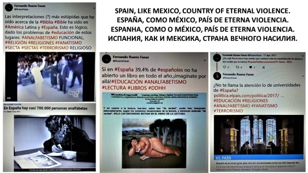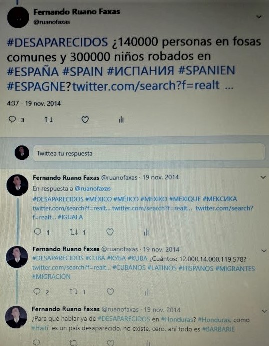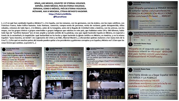 […] Hoy los “sacrificios humanos” en México no lo hacen los españoles, sino los mismos mexicanos, que se matan entre ellos con una endofagia poco vista en la actualidad, salvo entre los países del CUARTO MUNDO y QUINTO MUNDO: Malí, Libia, Somalia, Sudán del Sur, Afganistán, Siria, Irak (Iraq), en los países enfermos por el extremismo religioso, por el fanatismo radical. Los mexicanos se asesinan entre ellos, y de paso asesinan a los extranjeros que caen en las manos de las mafias narco-políticas: ¿dónde están los miles de migrantes que han desaparecido en México? […] Hoy, en el centro de España, en el mayor parque público del municipio de Madrid, es decir en Casa de Campo, literalmente hablando se venden mujeres, y esto lo ve todo el mundo, lo sabe todo el mundo, esto pasa en esa Europa que dicen que es “EL CONTINENTE DESARROLLADO”. ¡Imagínense entonces lo que pasa en “esos lugares de España en donde la gente nunca ve nada” […] ¿Y en México en dónde no se trafican seres humanos? ¡México entero es un mercado de personas: niños, niñas, mujeres, hombres. ¿Todavía alguien tiene dudas acerca del tráfico de personas y la prostitución en México? ¡Ahí está el ejemplo de #Tlaxcala #Tenancingo! https://twitter.com/search?q=%22Tlaxcala%22%20(%40RuanoFaxas)&src=typed_query&f=live, https://twitter.com/search?f=tweets&vertical=default&q=PROSTITUCION%20RuanoFaxas&src=typd&lang=es .