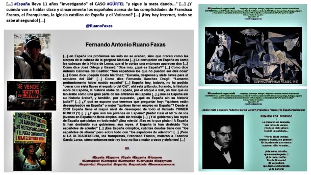 […] #España lleva 11 años “investigando” el CASO #GÜRTEL “y sigue la mata dando…” […] ¿Y cuándo van a hablar clara y sinceramente los españoles acerca de las complicidades de Francisco Franco, el Franquismo, la iglesia católica de España y el Vaticano? […] ¡Hoy hay Internet, todo se sabe al segundo! […]