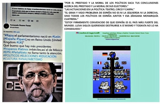 “¿De cuál España quieren ustedes que les hable, de la verdadera y real España o de la España que se han inventado algunos españoles, que parece que los 40 años de dictadura franquista les hizo perder la memoria? ¿Y así todavía hay alguien aquí que no sepa por qué los ingleses tomaron La Habana en 1762 y por qué en 1898 España y los españoles perdieron a Cuba, Puerto Rico, Filipinas y Guam? ¡Esa ineficacia de los españoles, que inclusive hoy mantiene a España entre los países más atrasados y pobres del llamado PRIMER MUNDO! […] ¡Pero si le quitaras el odio, la envidia, los conflictos internos, la traición, el fanatismo, el analfabetismo funcional, la desmemoria…, entonces ya no sería España!” Fernando Antonio Ruano Faxas (Filólogo, paisólogo e imagólogo cubano).