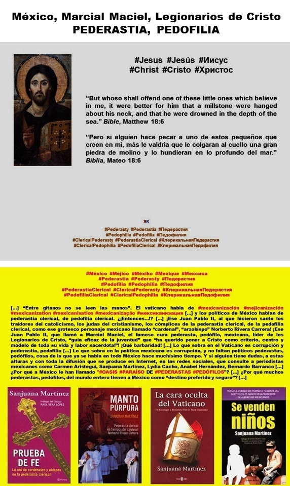 […] ¿Y en qué han cambiado España y México? […] En España, con los romanos, con los germanos, con los árabes, con los reyes católicos, con Francisco Franco, hubo tráfico humano, trata humana, comercio, compra-venta de personas, venta de esclavos, gente desaparecida, niños robados, crímenes de todo tipo […] En México, antes de la Conquista, antes de la llegada de Cristóbal Colón a América, con los aztecas, con los mayas, con los grupos étnicos o grupos amerindios o grupos indígenas que existían en este país, que hablaban entre 170 y 200 idiomas, había todo tipo de “sacrificio humano” (en el más amplio y variado sentido de la palabra), cosa que siguió haciendo España en México, en especial a través de la esclavitud y la Inquisición: ¡qué barbaridad no ha hecho y sigue haciendo la iglesia católica en México, en América, y en la misma España!: “para muestra, un botón”, los Legionarios de Cristo y su líder, Marcial Maciel https://twitter.com/search?f=tweets&q=PEDERASTIA%20RuanoFaxas&src=typd&lang=es […] ¿Recuerdan quiénes mataron a Sor Juana Inés de la Cruz? […]