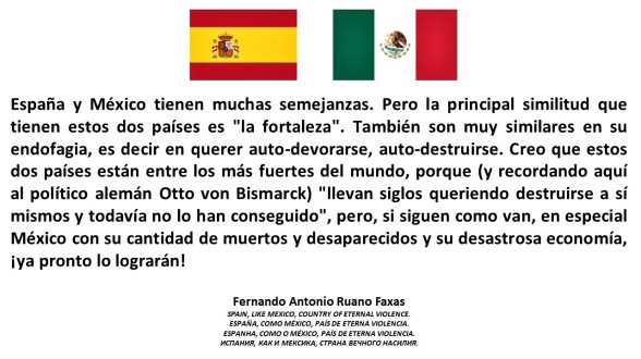 […] España y México tienen muchas semejanzas. Pero la principal similitud que tienen estos dos países es “la fortaleza”. También son muy similares en su endofagia, es decir en querer auto-devorarse, auto-destruirse. Creo que estos dos países están entre los más fuertes del mundo, porque (y recordando aquí al político alemán Otto von Bismarck) “llevan siglos queriendo destruirse a sí mismos y todavía no lo han conseguido”, pero, si siguen como van, en especial México con su cantidad de muertos y desaparecidos y su desastrosa economía, ¡ya pronto lo lograrán! […] Hay un rasgo común en la historia de España y los países iberoamericanos: las barbaridades que han hecho y siguen haciendo la iglesia, los curas, los sacerdotes, en especial los jerarcas católicos, ¡interminable y terrorífica la lista de fechorías! […]