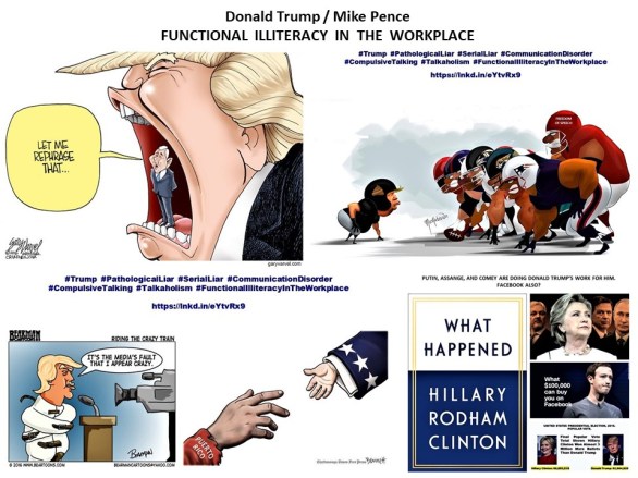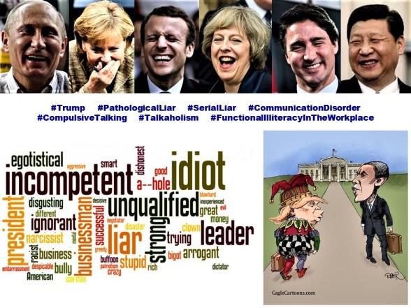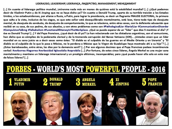 […] En cuanto al liderazgo político mundial, ¡mírenme nada más en manos de quiénes está la estabilidad mundial! […] ¿¡Qué podemos decir de Vladimir Putin y de Xi Jinping que no se haya dicho ya!? En cuanto a Donald Trump, aparte de su terrible traición a los Estados Unidos, a los estadounidenses, por aliarse a Rusia, a Putin, para lograr la presidencia, es decir un flagrante FRAUDE ELECTORAL, lo primero que salta a la vista, inclusive de los ciegos, es que este señor está desequilibrado mentalmente, está loco, tiene todo tipo de desajuste mental, de desajuste de conducta, de desajuste de comportamiento, lo que se relaciona, entre otras cosas, con la deficiente educación que recibió en su casa, de sus padres, de sus abuelos, y con otros problemas como son #PathologicalLiar #SerialLiar #CommunicationDisorder #CompulsiveTalking #Talkaholism #FunctionalIlliteracyInTheWorkplace. ¿Qué se puede esperar de un “líder” que dice 5 mentiras al día? ¡Y ése es Donald Trump! […] Y del Papa Francisco, ¿¡qué decir de él ya!? Lo han relacionado con las dictaduras argentinas, con el comunismo, han dicho que es cómplice de la pederastia clerical y de la tremenda corrupción del Banco Vaticano (IOR)… ¿Ustedes creen que un líder mundial en su sano juicio va a decir cosas como éstas: “El diablo es el culpable de las guerras en el Medio Oriente y en Ucrania” y “El diablo es el culpable de lo que le pasa a México, no le perdona a México que la Virgen de Guadalupe haya mostrado ahí a su hijo”? […] ¿Estas barrabasadas, entre otras, las dice por la demencia senil? […] Por eso algunos decimos que el Papa Francisco padece incontinencia verbal: #verborrea #logorrea #verbosidad #glosolalia #coprolalia […] ¡Por fortuna, de estos cinco líderes, Ángela Merkel es una mujer sana mentalmente y mantiene un liderazgo internacional y un prestigio altísimos, incomparables; pero ¿qué puede hacer ella sola en este mar de falsos líderes? […]