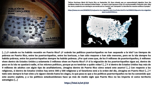 […] ¿Y cuándo no ha habido recesión en Puerto Rico? ¿Y cuándo los políticos puertorriqueños no han saqueado a la Isla? Los tiempos de pobreza en Puerto Rico, entre los puertorriqueños, entre los boricuas, o han sido mayores o han sido menores, pero en la Isla siempre ha habido pobreza, entre los puertorriqueños siempre ha habido pobreza. ¿Por qué crees que, de los 9 millones de puertorriqueños, 6 millones viven dentro de Estados Unidos y solamente 3 millones viven en Puerto Rico? ¡Y si la migración de los puertorriqueños sigue así, dentro de poco en la Isla no quedará nadie, ni los mismos políticos, porque ya no tendrían a quién robar! […] Y si dentro de Estados Unidos hay más de 9 millones de adultos con algún tipo de analfabetismo, ¡imagina dentro de Puerto Rico cómo estará este asunto! […] Con respecto a las religiones, si dentro de Estados Unidos hay entre 300 y 500 religiones y el fanatismo está a la orden del día, ¡imagina en Puerto Rico! […] Y todo esto siempre lo han visto y lo siguen viendo hasta los ciegos, lo que pasa es que a los políticos puertorriqueños no les ha convenido que este asunto explote, y a los políticos estadounidenses hace ya más de medio siglo que Puerto Rico no les importa ni como territorio estratégico […]