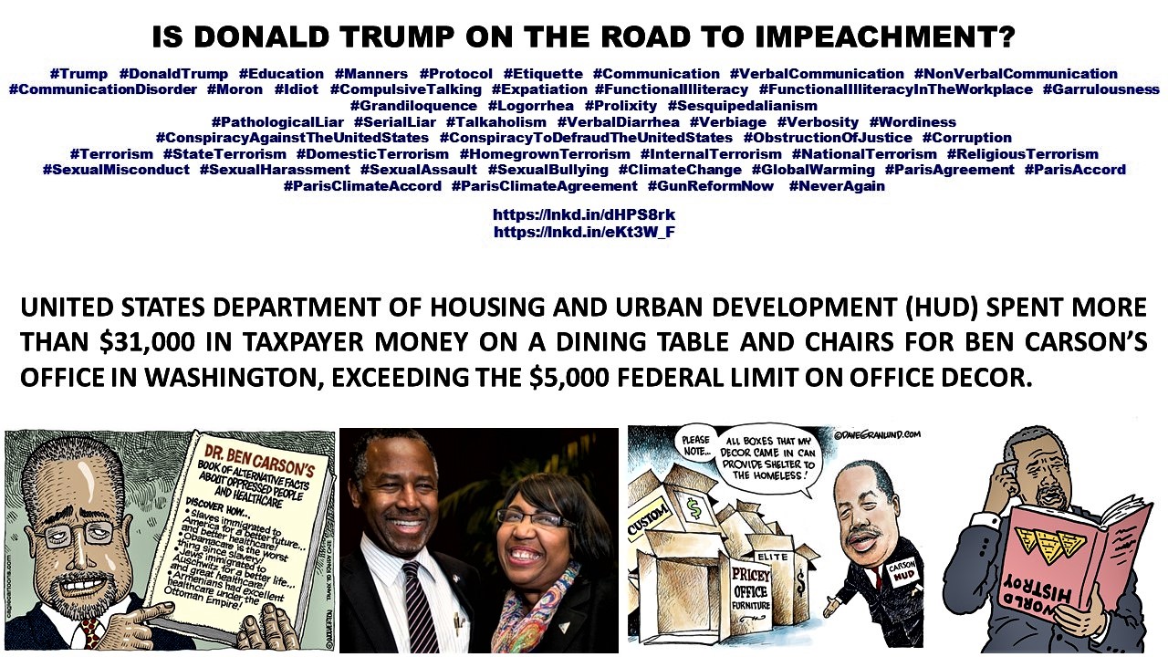 Trump. HUD SPENT MORE THAN $31,000 IN TAXPAYER MONEY ON A DINING TABLE AND CHAIRS FOR BEN CARSON_S OFFICE IN WASHINGTON, EXCEEDING THE $5,000 FEDERAL LIMIT ON OFFICE DECOR