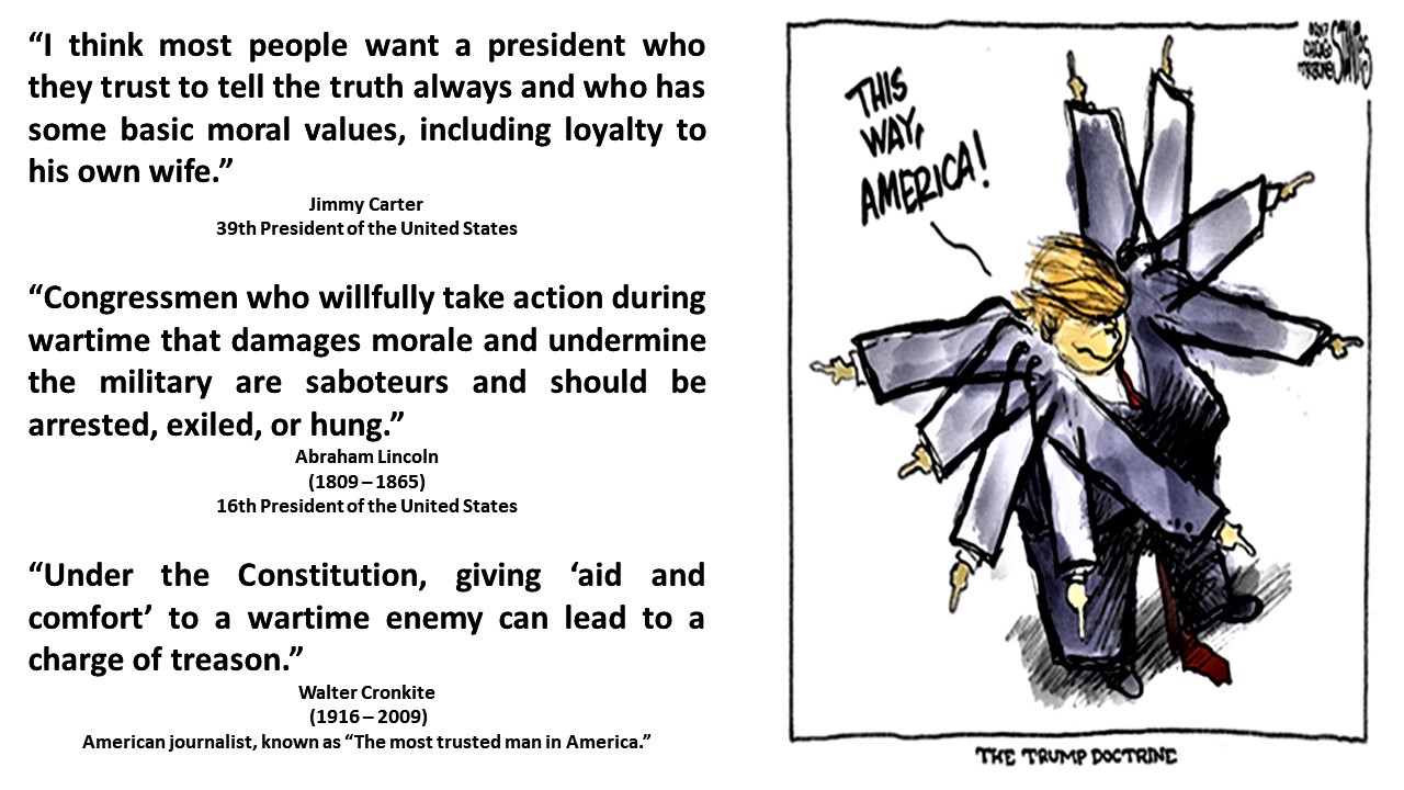 ← back to “DONALD TRUMP, MELANIA TRUMP, STORMY DANIELS, FREDERICK TRUMP, FRIEDRICH TRUMP, FREDERICK CHRIST TRUMP SR., FRED TRUMP, VLADIMIR PUTIN, RUSSIA, RUSIA, PAUL MANAFORT, RICK GATES, GEORGE PAPADOPOULOS, ROBERT MUELLER… “I think most people want a president who they trust to tell the truth always and who has some basic moral values, including loyalty to his own wife.” Jimmy Carter, 39th President of the United States […] “Congressmen who willfully take action during wartime that damages morale and undermine the military are saboteurs and should be arrested, exiled, or hung.” Abraham Lincoln, (1809 – 1865), 16th President of the United States […] “Under the Constitution, giving ‘aid and comfort’ to a wartime enemy can lead to a charge of treason.” Walter Cronkite, (1916 – 2009), American journalist, known as “The most trusted man in America.””