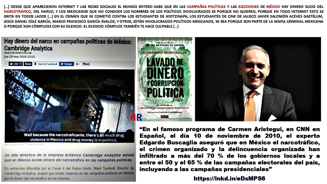 ← back to “[…] DESDE QUE APARECIERON INTERNET Y LAS REDES SOCIALES EL MUNDO ENTERO SABE QUE EN LAS CAMPAÑAS POLÍTICAS Y LAS ELECCIONES DE MÉXICO HAY DINERO SUCIO DEL NARCOTRÁFICO, DEL NARCO, Y LOS MEXICANOS QUE NO CONOCEN LOS NOMBRES DE LOS POLÍTICOS INVOLUCRADOS ES PORQUE NO QUIEREN, PORQUE EN TODO INTERNET ESTO SE GRITA EN TODOS LADOS […] EN EL CRIMEN QUE SE COMETIÓ CONTRA LOS ESTUDIANTES DE AYOTZINAPA, LOS ESTUDIANTES DE CINE DE JALISCO JAVIER SALOMÓN ACEVES GASTÉLUM, JESÚS DANIEL DÍAZ GARCÍA, MARCO FRANCISCO GARCÍA ÁVALOS, Y OTROS, ESTÁN INVOLUCRADOS POLÍTICOS MEXICANOS, YA SEA PORQUE SON PARTE DE LA MAFIA CRIMINAL MEXICANA O PORQUE SON CÓMPLICES CON SU SILENCIO: EL SILENCIO CÓMPLICE TAMBIÉN TE HACE CULPABLE […]”