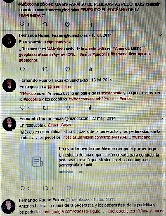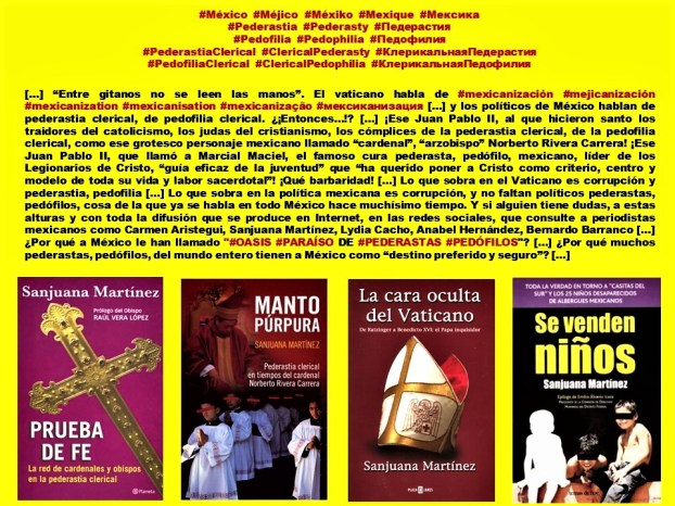 5. A MÉXICO SE LE HA LLAMADO OASIS, PARAÍSO, DE LA PEDERASTIA, LA PEDOFILIA, LA PROSTITUCIÓN INFANTIL, EL MERCADO DE NIÑOS Y NIÑAS PARA EL SERVICIO SEXUAL, CUESTIÓN QUE TODOS SABEN PERO QUE POCOS CRITICAN ABIERTAMENTE. ¡Y EL SILENCIO CÓMPLICE TAMBIÉN TE HACE CULPABLE! Y COMO EJEMPLO TERRIBLE DE AGRESIONES SEXUALES A NIÑOS Y JÓVENES EN MÉXICO ESTÁ EL CASO DE LOS LEGIONARIOS DE CRISTO, CON EL CURA MARCIAL MACIEL A LA CABEZA. Y SI UN MEXICANO DICE QUE NO CONOCE ESTE ESCÁNDALO DE LOS DUEÑOS DE LA UNIVERSIDAD ANÁHUAC, ENTONCES ¿EN QUÉ MUNDO VIVE? ¿NO LEE? AHÍ ESTÁN LOS CIENTOS DE LIBROS, TEXTOS, INFORMACIONES QUE TRATAN EL TEMA, COMO SON LOS DE LAS PERIODISTAS SANJUANA MARTÍNEZ, LYDIA CACHO Y CARMEN ARISTEGUI.