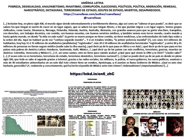 […] El mundo entero conoce el terrible daño que han hecho los políticos mexicanos a su país, empezando por la corrupción, y terminando con su involucramiento en el narcotráfico y el crimen organizado. Por eso a veces se le llama al estado mexicano “NARCOESTADO”. La falta de cultura, la ignorancia, el analfabetismo funcional, son características más que evidentes en los políticos mexicanos, empezando por sus presidentes y gobernadores, y principalmente Vicente Fox y Enrique Peña Nieto, ¡imaginemos entonces la situación educacional del pueblo! En estas elecciones presidenciales mexicanas 2018, algunas personas pregonan en las redes sociales y en reuniones de todo tipo que si Andrés Manuel López Obrador llega a la presidencia México se convertirá en una Venezuela. Obviamente, las personas que dicen esto son unos típicos analfabetos funcionales, desconocen la información elemental acerca de México, porque si supieran los lugares que ocupa México en el mundo en ciertos parámetros decisivos para la vida humana, no dirían tales barrabasadas. Veamos, por ejemplo, algunos datos […]