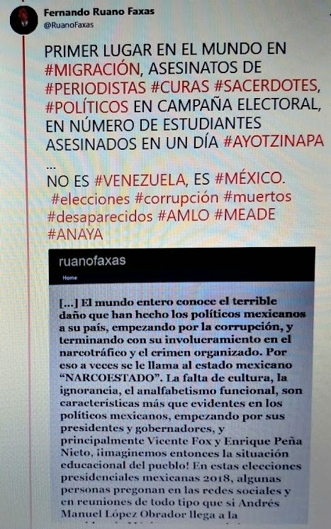 FERNANDO ANTONIO RUANO FAXAS. IMAGOLOGÍA, PAISOLOGÍA, ELECCIONES, MUERTOS, DESAPARECIDOS, VENEZUELA. MÉXICO, PRIMER LUGAR EN MIGRACIÓN, ASESINATOS DE PERIODISTAS, POLÍTICOS, CURAS,
