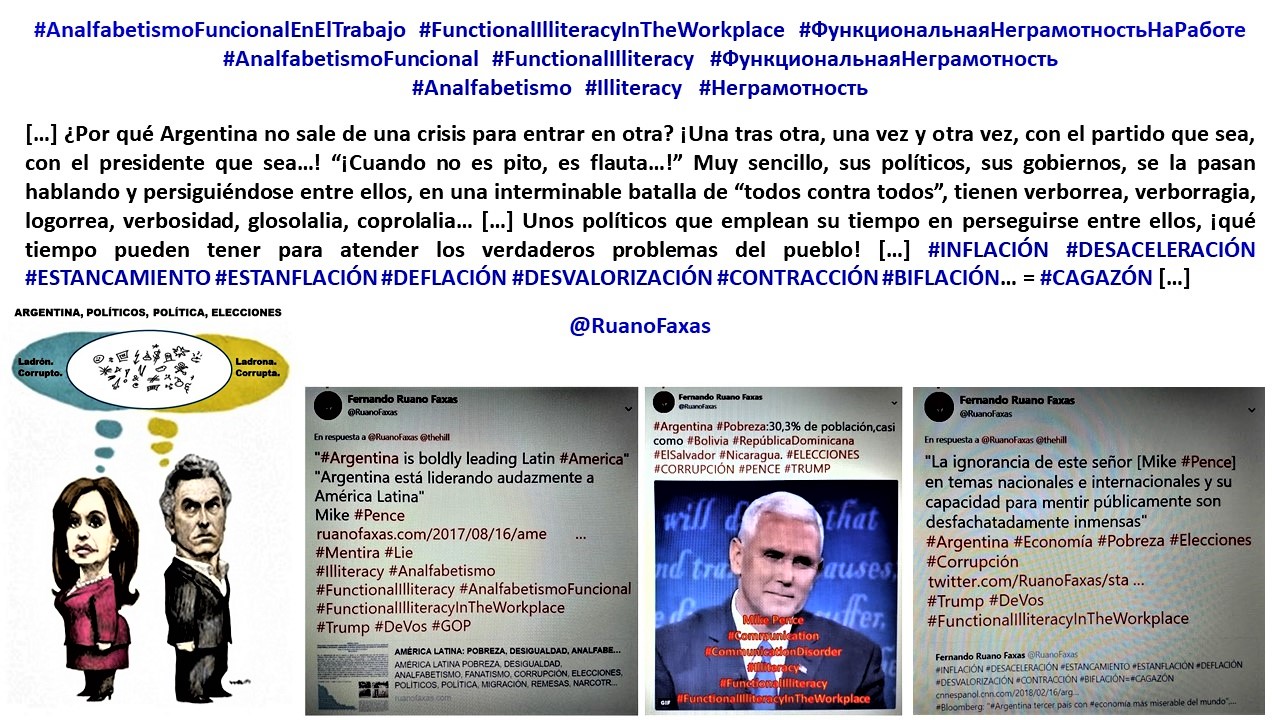 ← back to “[…] ¿Por qué Argentina no sale de una crisis para entrar en otra? ¡Una tras otra, una vez y otra vez, con el partido que sea, con el presidente que sea…! “¡Cuando no es pito, es flauta…!” Muy sencillo, sus políticos, sus gobiernos, se la pasan hablando y persiguiéndose entre ellos, en una interminable batalla de “todos contra todos”, tienen verborrea, verborragia, logorrea, verbosidad, glosolalia, coprolalia… […] Unos políticos que emplean su tiempo en perseguirse entre ellos, ¡qué tiempo pueden tener entonces para atender los verdaderos problemas del pueblo! […] #RECESIÓN, #INFLACIÓN, #DEPRESIÓN, #DEPREFLACIÓN, #DESACELERACIÓN, #ESTANCAMIENTO, #ESTANFLACIÓN, #DEFLACIÓN, #DESVALORIZACIÓN, #CONTRACCIÓN, #BIFLACIÓN… = #CAGAZÓN […]”