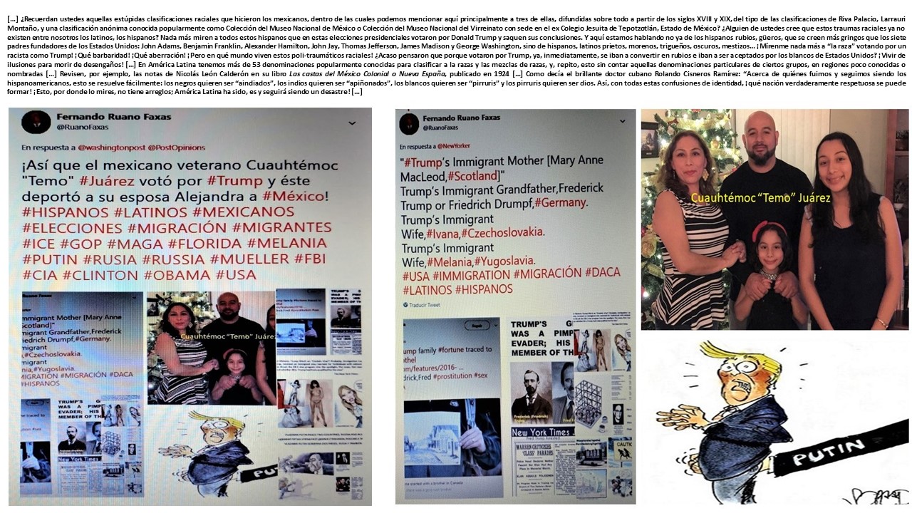 ← back to “[…] Como decía el brillante doctor cubano Rolando Augusto Cisneros Ramírez: “Acerca de quiénes fuimos y seguimos siendo los hispanoamericanos, esto se resuelve fácilmente: los negros quieren ser ‘aindiados’, los indios quieren ser ‘apiñonados’, los blancos quieren ser ‘pirruris’ y los pirruris quieren ser dios.” Así, con todas estas confusiones de identidad, ¡qué nación verdaderamente respetuosa se puede formar! ¡Esto, por donde lo mires, no tiene arreglos; América Latina ha sido, es y seguirá siendo un desastre! […]”