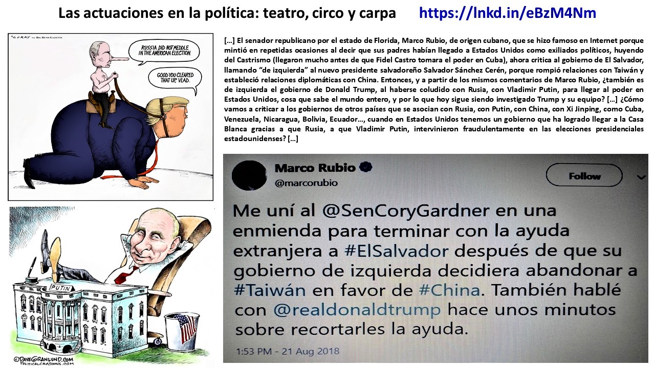 ← back to “El senador republicano por el estado de Florida, Marco Rubio, de origen cubano, que se hizo famoso en Internet porque mintió en repetidas ocasiones al decir que sus padres habían llegado a Estados Unidos como exiliados políticos, huyendo del Castrismo (llegaron mucho antes de que Fidel Castro tomara el poder en Cuba), ahora critica al gobierno de El Salvador, llamando “de izquierda” al nuevo presidente salvadoreño Salvador Sánchez Cerén, porque rompió relaciones con Taiwán y estableció relaciones diplomáticas con China. Entonces, y a partir de los mismos comentarios de Marco Rubio, ¿también es de izquierda el gobierno de Donald Trump, al haberse coludido con Rusia, con Vladimir Putin, para llegar al poder en Estados Unidos, cosa que sabe el mundo entero, y por lo que hoy sigue siendo investigado Trump y su equipo?”