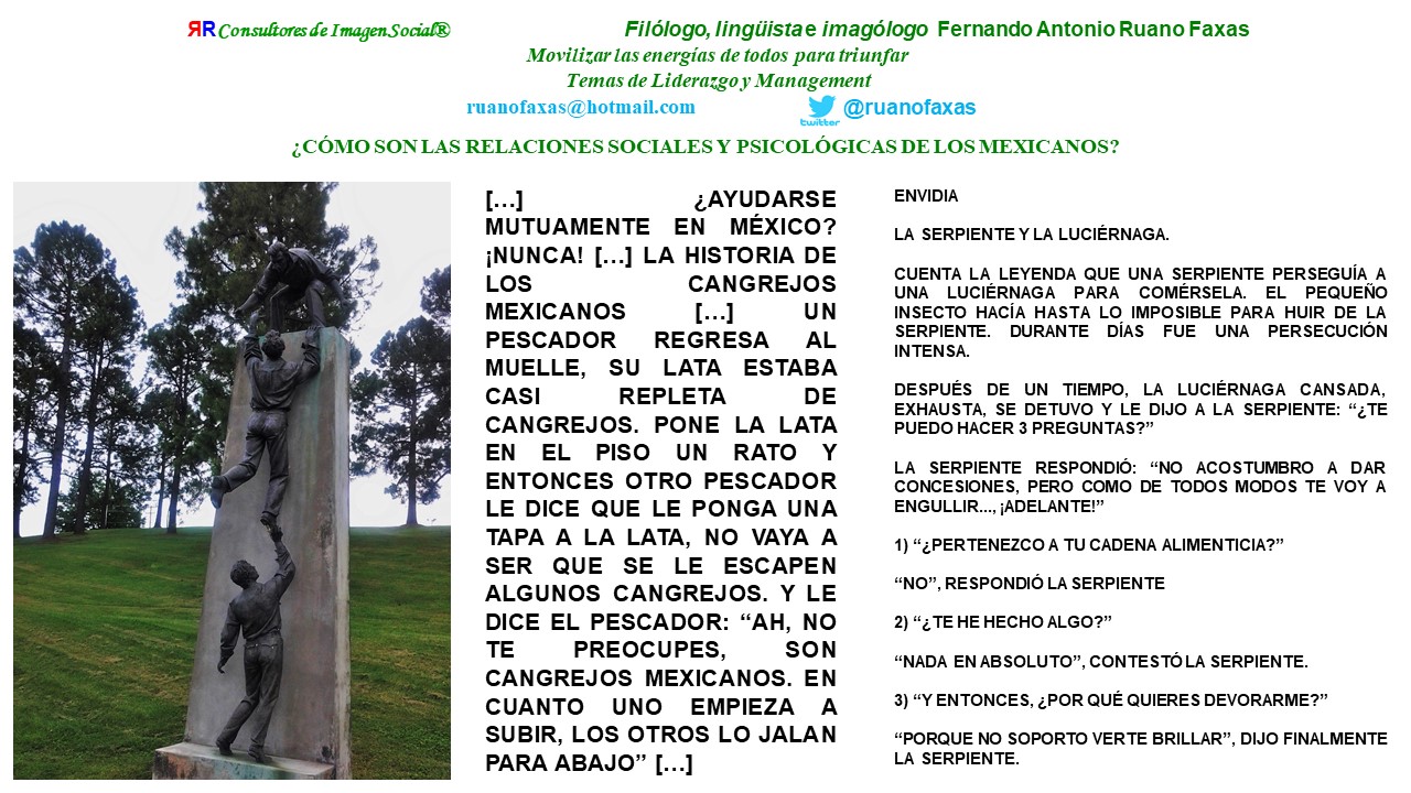 FERNANDO ANTONIO RUANO FAXAS. IMAGOLOGÍA, PAISOLOGÍA, MÉXICO, MEXICANOS, PSICOLOGÍA, SOCIOLOGÍA, RELACIONES, COMUNICACIÓN, LIDERAZGO, MANAGEMENT, CANGREJOS MEXICANOS, ENVIDIA, SERPIENTE Y LUCIÉRNAGA
