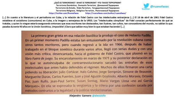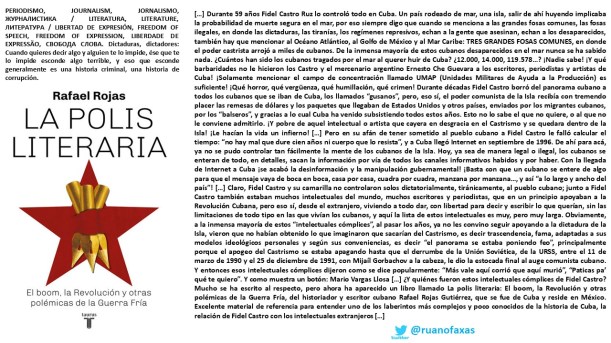 […] Durante 59 años Fidel Castro Ruz lo controló todo en Cuba. Un país rodeado de mar, una isla, salir de ahí huyendo implicaba la probabilidad de muerte segura en el mar, por eso siempre digo que cuando se menciona a las grandes fosas comunes, las fosas ilegales, en donde las dictaduras, las tiranías, los regímenes represivos, echan a la gente que asesinan, echan a los desaparecidos, también hay que mencionar al Océano Atlántico, al Golfo de México y al Mar Caribe: TRES GRANDES FOSAS COMUNES, en donde el poder castrista arrojó a miles de cubanos. De la inmensa mayoría de estos cubanos desaparecidos en el mar nunca se ha sabido nada. ¿Cuántos han sido los cubanos tragados por el mar al querer huir de Cuba? ¿12.000, 14.000, 119.578…? ¡Nadie sabe! ¡Y qué barbaridades no le hicieron los Castro y el mercenario argentino Ernesto Che Guevara a los escritores, periodistas y artistas de Cuba! ¡Solamente mencionar el campo de concentración llamado UMAP (Unidades Militares de Ayuda a la Producción) es suficiente! ¡Qué horror, qué vergüenza, qué humillación, qué crimen! Durante décadas Fidel Castro borró del panorama cubano a todos los cubanos que se iban de Cuba, los llamados “gusanos”, pero, eso sí, el poder comunista de la Isla recibía con tremendo placer las remesas de dólares y los paquetes que llegaban de Estados Unidos y otros países, enviados por los migrantes cubanos, por los “balseros”, y gracias a lo cual Cuba ha venido subsistiendo todos estos años. Esto no lo sabe el que no quiere, o al que no le conviene admitirlo. ¡Y pobre de aquel intelectual o artista que cayera en desgracia en el Castrismo y se quedara dentro de la Isla! ¡Le hacían la vida un infierno! […] Pero en su afán de tener sometido al pueblo cubano a Fidel Castro le falló calcular el tiempo: “no hay mal que dure cien años ni cuerpo que lo resista”, y a Cuba llegó Internet en septiembre de 1996. De ahí para acá, ya no se pudo controlar tan fácilmente la mente de los cubanos de la Isla. Hoy, ya sea de manera legal o ilegal, los cubanos se enteran de todo, en detalles, sacan la información por vía de todos los canales informativos habidos y por haber. Con la llegada de Internet a Cuba ¡se acabó la desinformación y la manipulación gubernamental! ¡Basta con que un cubano se entere de algo para que el mensaje vaya de boca en boca, casa por casa, cuadra por cuadra, manzana por manzana…, y así “a lo largo y ancho del país”! […] Claro, Fidel Castro y su camarilla no controlaron solos dictatorialmente, tiránicamente, al pueblo cubano; junto a Fidel Castro también estaban muchos intelectuales del mundo, muchos escritores y periodistas, que en un principio apoyaban a la Revolución Cubana, pero eso sí, desde el extranjero, viviendo a todo dar, con libertad para decir y escribir lo que querían, sin las limitaciones de todo tipo en las que vivían los cubanos, y aquí la lista de estos intelectuales es muy, pero muy larga. Obviamente, a la inmensa mayoría de estos “intelectuales cómplices”, al pasar los años, ya no les convino seguir apoyando a la dictadura de la Isla, vieron que no habían obtenido lo que imaginaron que sacarían del Castrismo, es decir trascendencia, fama, adaptadas a sus modelos ideológicos personales y según sus conveniencias, es decir “el panorama se estaba poniendo feo”, principalmente porque el apogeo del Castrismo se estaba apagando hasta que el derrumbe de la Unión Soviética, de la URSS, entre el 11 de marzo de 1990 y el 25 de diciembre de 1991, con Mijaíl Gorbachov a la cabeza, le dio la estocada final al auge comunista cubano. Y entonces esos intelectuales cómplices dijeron como se dice popularmente: “Más vale aquí corrió que aquí murió”, “Paticas pa’ qué te quiero”. Y como muestra un botón: Mario Vargas Llosa […] El 16 de abril de 1961 Fidel Castro establece el socialismo (comunismo) en Cuba, a la imagen y semejanza de la URSS. Los “intelectuales cómplices” de Fidel conocían perfectamente de qué se trataba, y quien lo niegue estaría asegurando entonces que esos escritores tan destacados, tan ilustres, tan cultos, tan conocedores del mundo, no sabían lo que pasaba durante 40 años en la Unión Soviética. ¡Imposible! ¡Claro que sabían muy bien lo que estaban haciendo! […] ¿Y quiénes fueron estos intelectuales cómplices de Fidel Castro? Mucho se ha escrito al respecto, pero ahora ha aparecido un libro llamado La polis literaria: El boom, la Revolución y otras polémicas de la Guerra Fría, del historiador y escritor cubano Rafael Rojas Gutiérrez, que se fue de Cuba y reside en México. Excelente material de referencia para entender uno de los laberintos más complejos y poco conocidos de la historia de Cuba, la relación de Fidel Castro con los intelectuales extranjeros […]