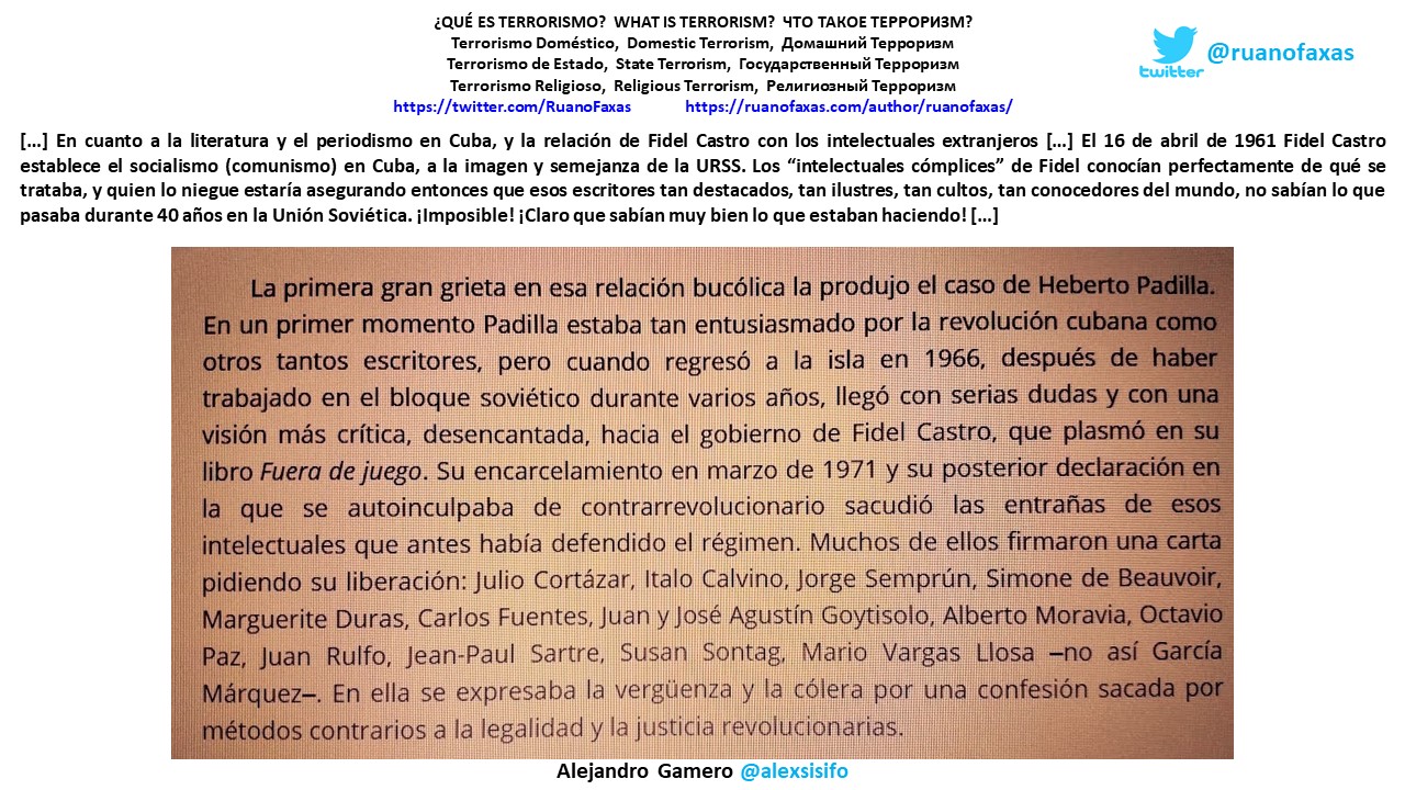← back to “[…] Durante 59 años Fidel Castro Ruz lo controló todo en Cuba. Un país rodeado de mar, una isla, salir de ahí huyendo implicaba la probabilidad de muerte segura en el mar, por eso siempre digo que cuando se menciona a las grandes fosas comunes, las fosas ilegales, en donde las dictaduras, las tiranías, los regímenes represivos, echan a la gente que asesinan, echan a los desaparecidos, también hay que mencionar al Océano Atlántico, al Golfo de México y al Mar Caribe: TRES GRANDES FOSAS COMUNES, en donde el poder castrista arrojó a miles de cubanos. De la inmensa mayoría de estos cubanos desaparecidos en el mar nunca se ha sabido nada […] Claro, Fidel Castro y su camarilla no controlaron solos dictatorialmente, tiránicamente, al pueblo cubano; junto a Fidel Castro también estaban muchos intelectuales del mundo, muchos escritores y periodistas, que en un principio apoyaban a la Revolución Cubana […] ¿Y quiénes fueron estos intelectuales cómplices de Fidel Castro? Mucho se ha escrito al respecto, pero ahora ha aparecido un libro llamado La polis literaria: El boom, la Revolución y otras polémicas de la Guerra Fría, del historiador y escritor cubano Rafael Rojas Gutiérrez, que se fue de Cuba y reside en México. Excelente material de referencia para entender uno de los laberintos más complejos y poco conocidos de la historia de Cuba, la relación de Fidel Castro con los intelectuales extranjeros […]”