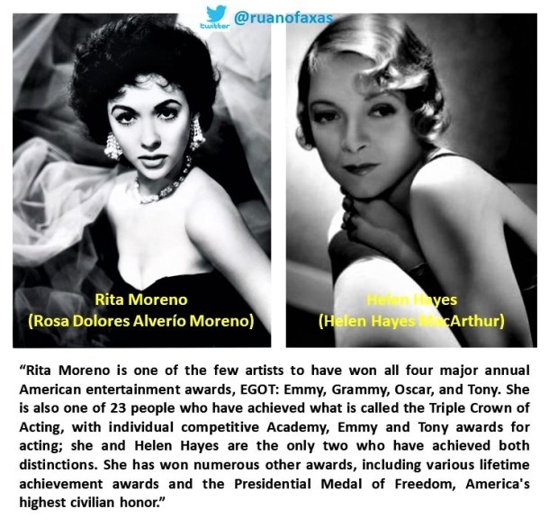 La TRIPLE CROWN OF ACTING y el EGOT juntos solamente lo tienen la puertorriqueña Rita Moreno y la estadounidense Helen Hayes.