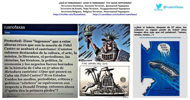 PAISOLOGÍA CUBANA E IMAGOLOGÍA CUBANA […] Cada año son miles los cubanos que se quieren ir de Cuba […] Unos logran llegar a Estados Unidos o a otro lugar, otros desaparecen en el mar, se mueren, se los comen los tiburones. ¿Y cuándo es que la gente se lanza a estas aventuras tan peligrosas como echarse al mar a ver qué pasa? ¡Cuando se está desesperado! ¡Cuando ya lo que queda es “la última opción”! ¿Cuántos son los cubanos muertos y desaparecidos en la dictadura de Fidel Castro? ¡Nadie sabe! ¿Quién sabe?: ¿12,000; 14,000; 119,578…? […] La huida de cubanos de Cuba es tan grande que no dudo que en esta estampida un día hasta los Castro quieran escapar de la Isla. Por eso todos los días miro hacia Cuba, porque pienso que es posible que llegue una balsa con Fidel Castro o Raúl, o su familia, y entonces, si tal fuera el caso, habría que gritarle a la gente que siempre ayuda: “No, a ésos no los rescaten, vuelvan a echar esa balsa al mar, y que la corriente marina se los lleve para allá, para Rusia, con Putin y los rusos”. ¡Bueno, y eso a ver si allá los quieren! […] Recordemos las palabras de José Martí: “¿Haremos los cubanos una revolución por el derecho, por la persona del hombre y su derecho total y negaremos, al día siguiente del triunfo, los derechos por que hemos batallado?” […] ¿Recuerdan ustedes las palabras que Fidel Castro dijo el 24 de abril de 1959? “Libertad con pan, pan sin terror”. La realidad es que en 57 años de Castrismo, en Cuba no ha habido pan y lo que ha sobrado y sigue sobrando es terror. ¿Alguien tiene alguna duda al respecto? Pregúntenle a los disidentes, a los opositores, que siguen viviendo dentro de Cuba: ¡UN INFIERNO! […] ¿Qué si el gobierno de Castro es un gobierno terrorista? ¡Claro que lo es! ¿Ya olvidaron ustedes lo que significa “Terrorismo de Estado”? […] Muchos dicen: “es que con Fidel Castro Cuba ha tenido muchos logros”. Es verdad: educación, medicina, deporte… Pero eso también lo han logrado muchos otros países, ¡y todavía han logrado muchísimo más!, países con excelentes calidad de vida, sin perseguir a sus ciudadanos, sin restringir las libertades de sus ciudadanos, sin establecer totalitarismo, dictadura, tiranía: Suecia, Dinamarca, Noruega, Finlandia, Suiza, Canadá, Australia, Alemania, Países Bajos […] ¿Y cómo subsiste Cuba? Gracias a las remesas que mandan todos estos hombres y mujeres que tuvieron que huir de la dictadura castrista, gracias a estos cubanos “disidentes”, gracias a estos cubanos “opositores”, a los que Castro y su pandilla han llamado “los gusanos”. Desde los mismos primeros años de la tiranía castrista, estos disidentes, opositores cubanos, que están regados por todo el mundo, pero que viven principalmente en Estados Unidos, han enviado de todo a Cuba: medicina, comida, ropa, pero sobre todo dinero, dólares […] En 2013 el total aproximado de estas remesas de dólares a Cuba desde Estados Unidos fue de 2,497,031,206 […] y aquí estamos hablando no de millones, sino de BILLONES, es decir millón de millones. Y esto, que conste, fue sólo el envío desde Estados Unidos, porque si sumamos el envío de todas las remesas de “los cubanos en el extranjero”, “los cubanos de afuera”, a Cuba, a “los cubanos de adentro”, entonces la cifra sería inmensísima: 2,777,363,411. ¿Ahora se entiende bien por qué y cómo subsisten Cuba y “los cubanos de adentro”? […] Claro, ahora los cubanos tenemos Internet, nos enteramos de todo al segundo, ya Castro y su pandilla no pueden manipularnos como les da gana. Y las cosas han cambiado para Cuba y los cubanos. Con esta visita de Obama a Cuba tenemos los cubanos nuevos horizontes, tenemos esperanzas concretas, en absolutamente todos los sentidos. Por ahora los cubanos de Cuba lo que queremos es trabajo y comida. “La libertad”, así como vamos, pronto llegará. Y con respecto a los cubanos republicanos o demócratas de la alta política de Estados Unidos que quieren que se mantenga el embargo, el bloqueo, a Cuba, ¡esta gente vive en el pasado!, ¡ya son como extraterrestres en este planeta!, y ahí tienen los resultados. La inmensa mayoría de los cubanos de Estados Unidos nunca votará por ellos en elecciones. ¿Marco Rubio, Ted Cruz, o cosa parecida, para presidente? ¡Ni soñarlo! ¡Pero si ahora Marco Rubio no ganó ni en su propio estado, Florida! ¡Y ya para qué hablar de personas como Bob Menéndez, Ros Lehtinen, Díaz Balart, Curbelo y semejantes!: “su carnaval pasó”, “ese disco se rayó” […]