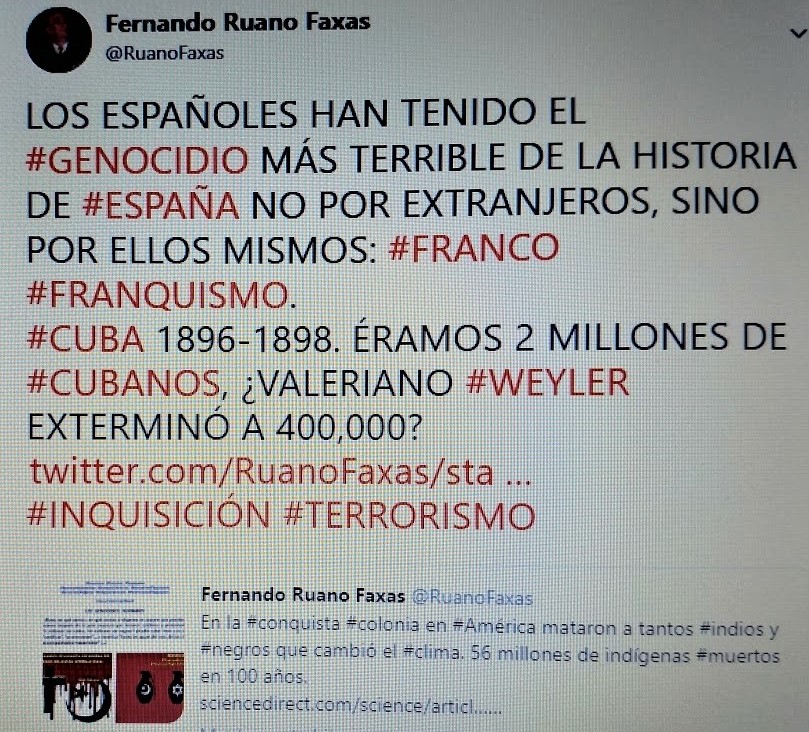 FERNANDO ANTONIO RUANO FAXAS. ESPAÑA, ESPAÑOLES, CONQUISTA, COLONIA, MÉXICO, GENOCIDIO, HOLOCAUSTO, MUERTOS, VALERIANO WEYLER, CUBA, CUBANOS, TERRORISMO, INQUISICIÓN, FRANCO, VATICANO