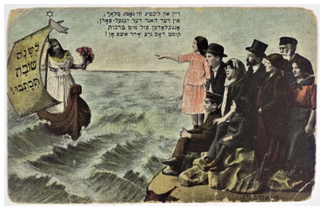 Esta postal fue creada e impresa en Varsovia, hacia finales de los años veinte. Muestra a un grupo de, presumiblemente inmigrantes judíos, esperando su barco. Migración, Genocidio, Holocausto, Pogromo, Pogrom, Israel