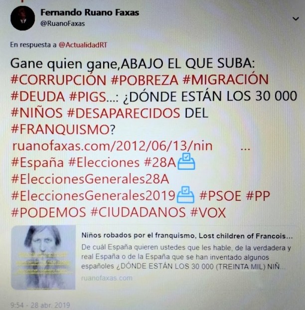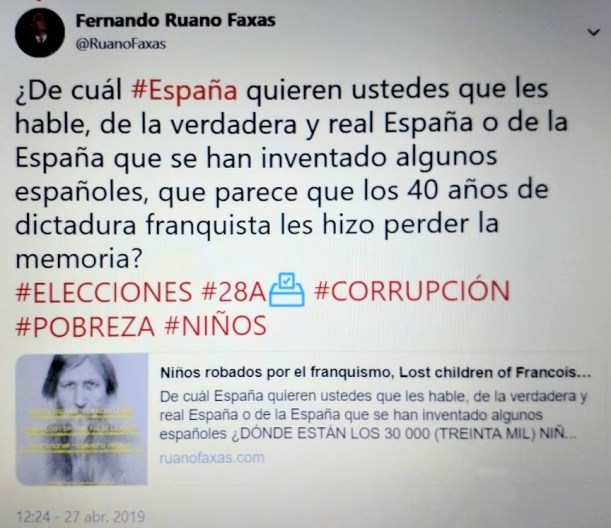 Niños robados por el franquismo, Lost children of Francoism, Meninos roubados pelo franquismo, Affaire des enfants volés du franquisme, Украденные дети в годы франкизма. ¡Esa España cómplice, cuántas deudas tiene con “los españoles de afuera” pero sobre todo con “los españoles de adentro”! LOS NIÑOS ROBADOS POR CURAS Y MONJAS EN EL FRANQUISMO. #España #Spain #Испания Imagen Política #ImagenPolítica Political Image #PoliticalImage Политический Имидж #ПолитическийИмидж Imagología Política #ImagologíaPolítica Political Imagology #PoliticalImagology Политическая Имагология #ПолитическаяИмагология […] #ImagologíaClerical #ClericalImagology #КлерикальнаяИмагология