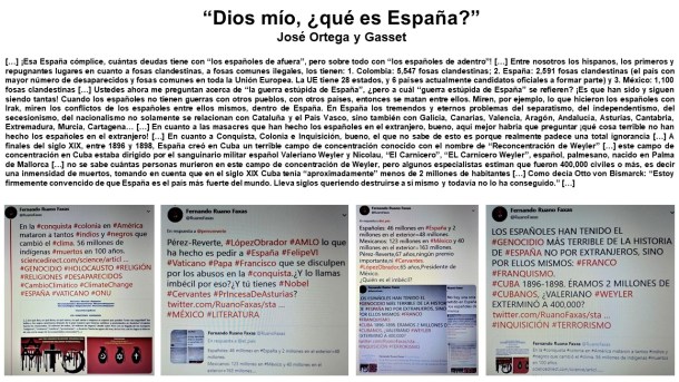 “¿De cuál España quieren ustedes que les hable, de la verdadera y real España o de la España que se han inventado algunos españoles, que parece que los 40 años de dictadura franquista les hizo perder la memoria? ¿Y así todavía hay alguien aquí que no sepa por qué los ingleses tomaron La Habana en 1762 y por qué en 1898 España y los españoles perdieron a Cuba, Puerto Rico, Filipinas y Guam? ¡Esa ineficacia de los españoles, que inclusive hoy mantiene a España entre los países más atrasados y pobres del llamado PRIMER MUNDO! […] ¡Pero si le quitaras el odio, la envidia, los conflictos internos, la traición, el fanatismo, el analfabetismo funcional, la desmemoria…, entonces ya no sería España!” Fernando Antonio Ruano Faxas (Filólogo, paisólogo e imagólogo cubano).