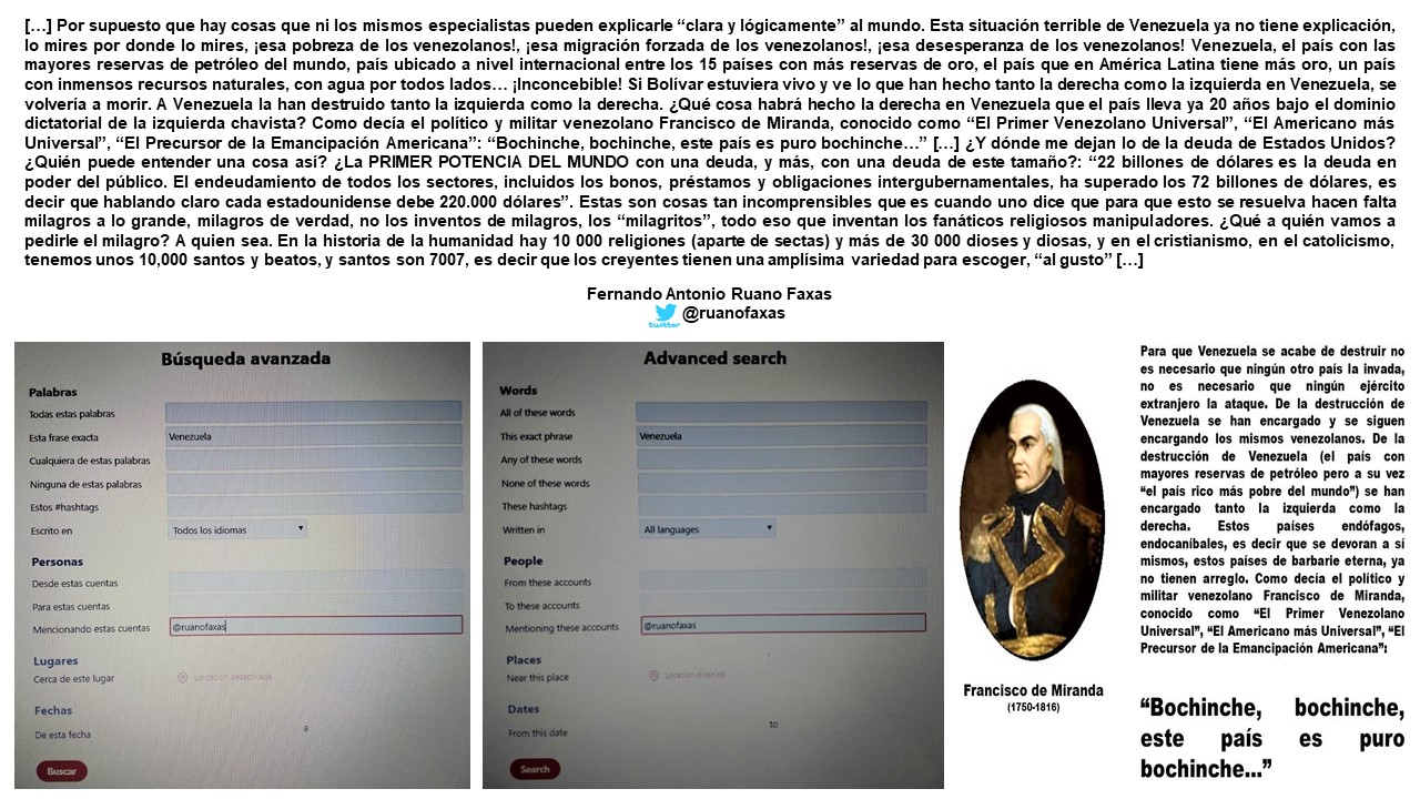 ← back to “[…] Por supuesto que hay cosas que ni los mismos especialistas pueden explicarle “clara y lógicamente” al mundo. Esta situación terrible de Venezuela ya no tiene explicación, lo mires por donde lo mires, ¡esa pobreza de los venezolanos!, ¡esa migración forzada de los venezolanos!, ¡esa desesperanza de los venezolanos! Venezuela, el país con las mayores reservas de petróleo del mundo, país ubicado a nivel internacional entre los 15 países con más reservas de oro, el país que en América Latina tiene más oro, un país con inmensos recursos naturales, con agua por todos lados… ¡Inconcebible! Si Bolívar estuviera vivo y ve lo que han hecho tanto la derecha como la izquierda en Venezuela, se volvería a morir. A Venezuela la han destruido tanto la izquierda como la derecha. ¿Qué cosa habrá hecho la derecha en Venezuela que el país lleva ya 20 años bajo el dominio dictatorial de la izquierda chavista? Como decía el político y militar venezolano Francisco de Miranda, conocido como “El Primer Venezolano Universal”, “El Americano más Universal”, “El Precursor de la Emancipación Americana”: “Bochinche, bochinche, este país es puro bochinche…” […] ¿Y dónde me dejan lo de la deuda de Estados Unidos? ¿Quién puede entender una cosa así? ¿La PRIMER POTENCIA DEL MUNDO con una deuda, y más, con una deuda de este tamaño?: “22 billones de dólares es la deuda en poder del público. El endeudamiento de todos los sectores, incluidos los bonos, préstamos y obligaciones intergubernamentales, ha superado los 72 billones de dólares, es decir que hablando claro cada estadounidense debe 220.000 dólares”. Estas son cosas tan incomprensibles que es cuando uno dice que para que esto se resuelva hacen falta milagros a lo grande, milagros de verdad, no los inventos de milagros, los “milagritos”, todo eso que inventan los fanáticos religiosos manipuladores. ¿Qué a quién vamos a pedirle el milagro? A quien sea. En la historia de la humanidad hay 10 000 religiones (aparte de sectas) y más de 30 000 dioses y diosas, y en el cristianismo, en el catolicismo, tenemos unos 10,000 santos y beatos, y santos son 7007, es decir que los creyentes tienen una amplísima variedad para escoger, “al gusto” […]”
